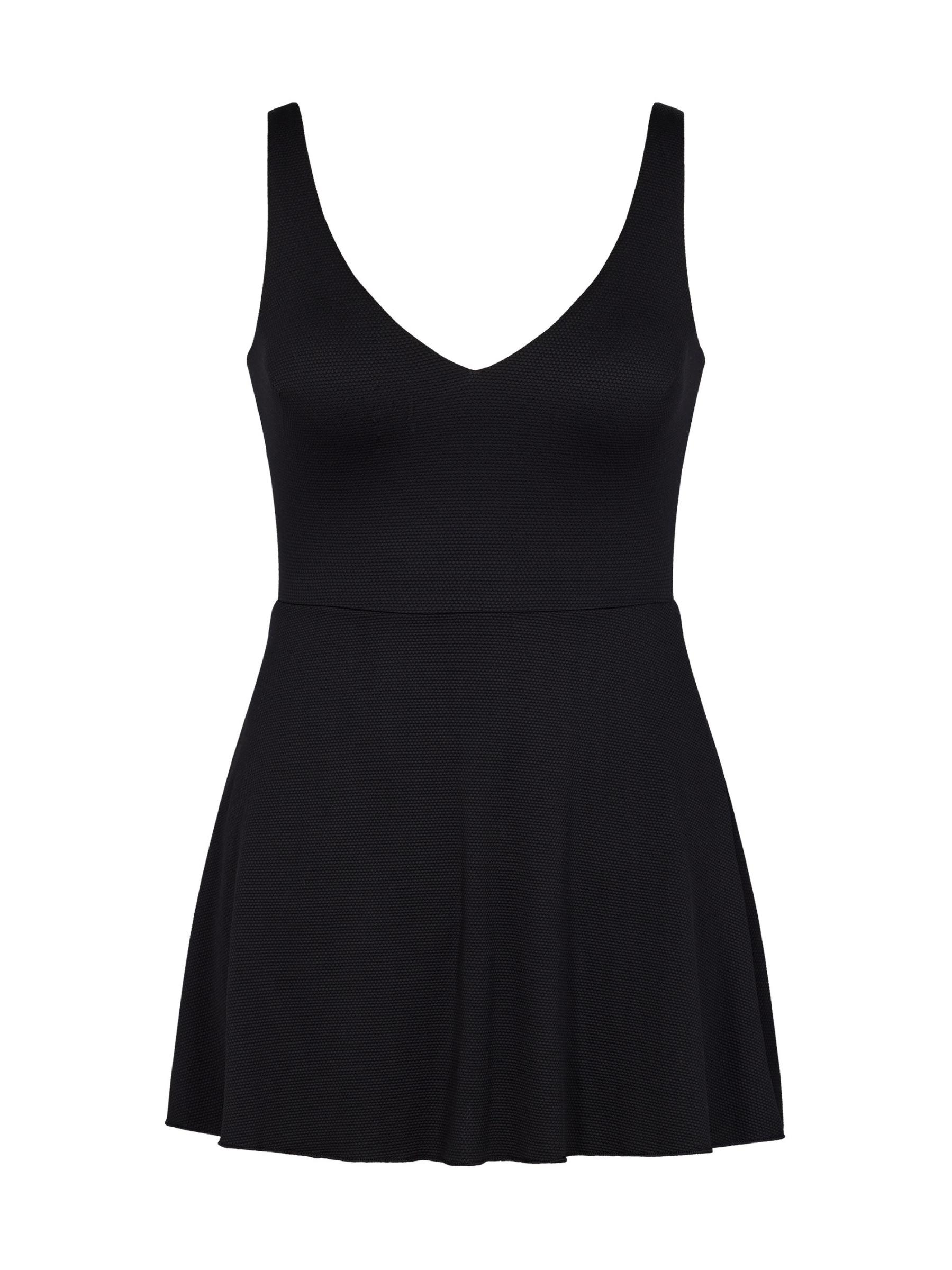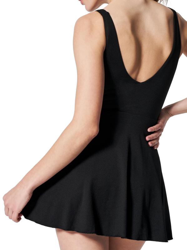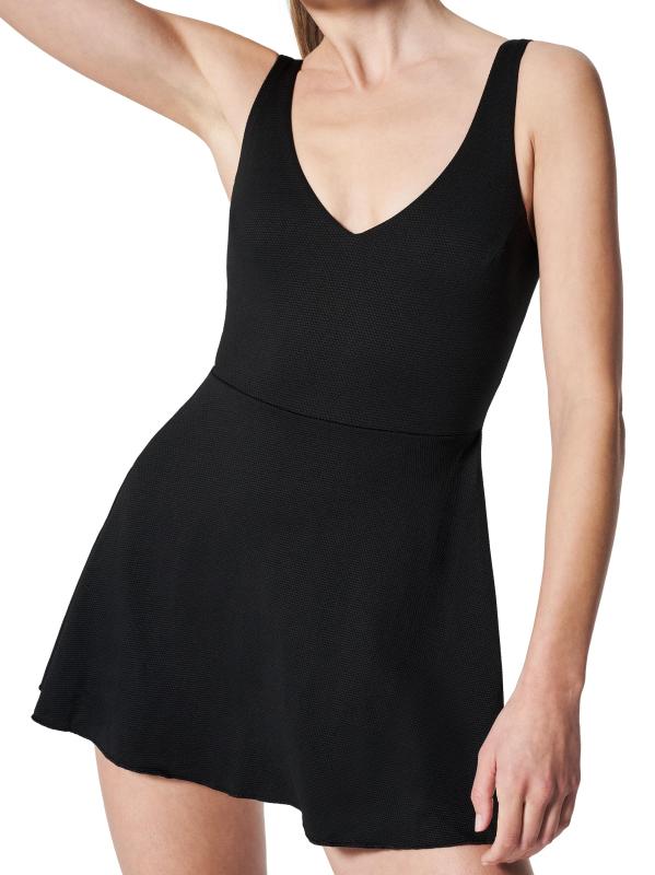 Designed with a smoothing textured piqué fabric, this shaping swim dress by Spanx features a plunging V-neck, a flounce skirt, and no-dig leg openings.