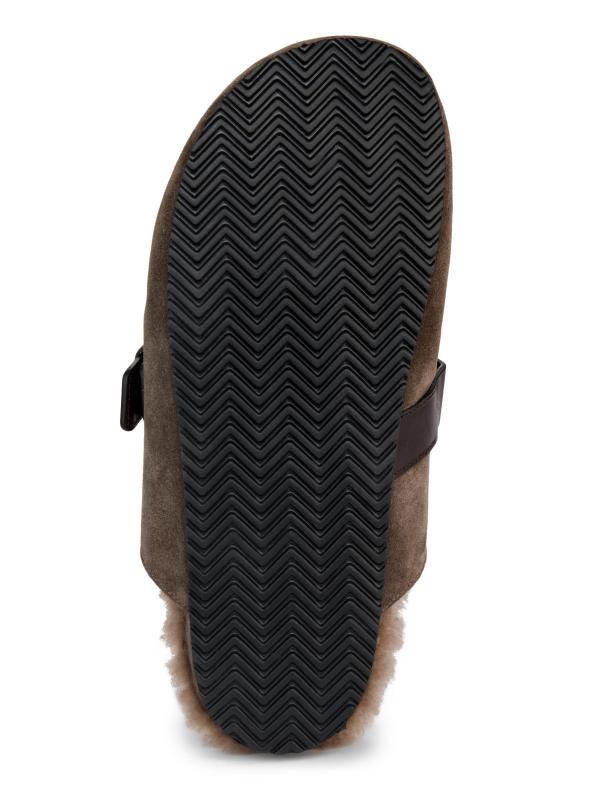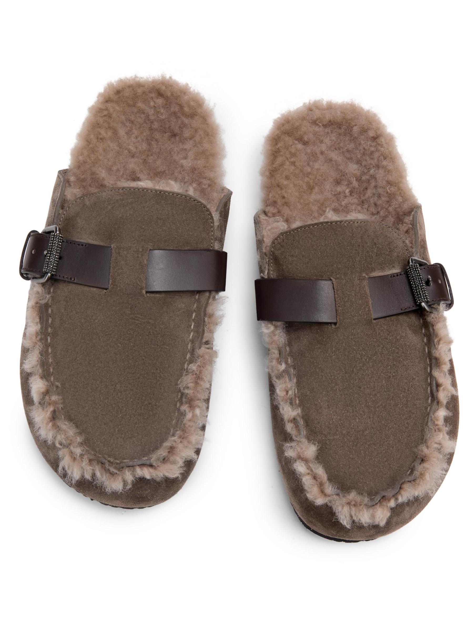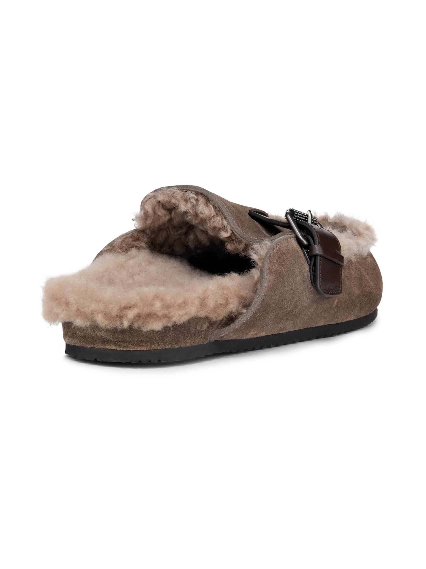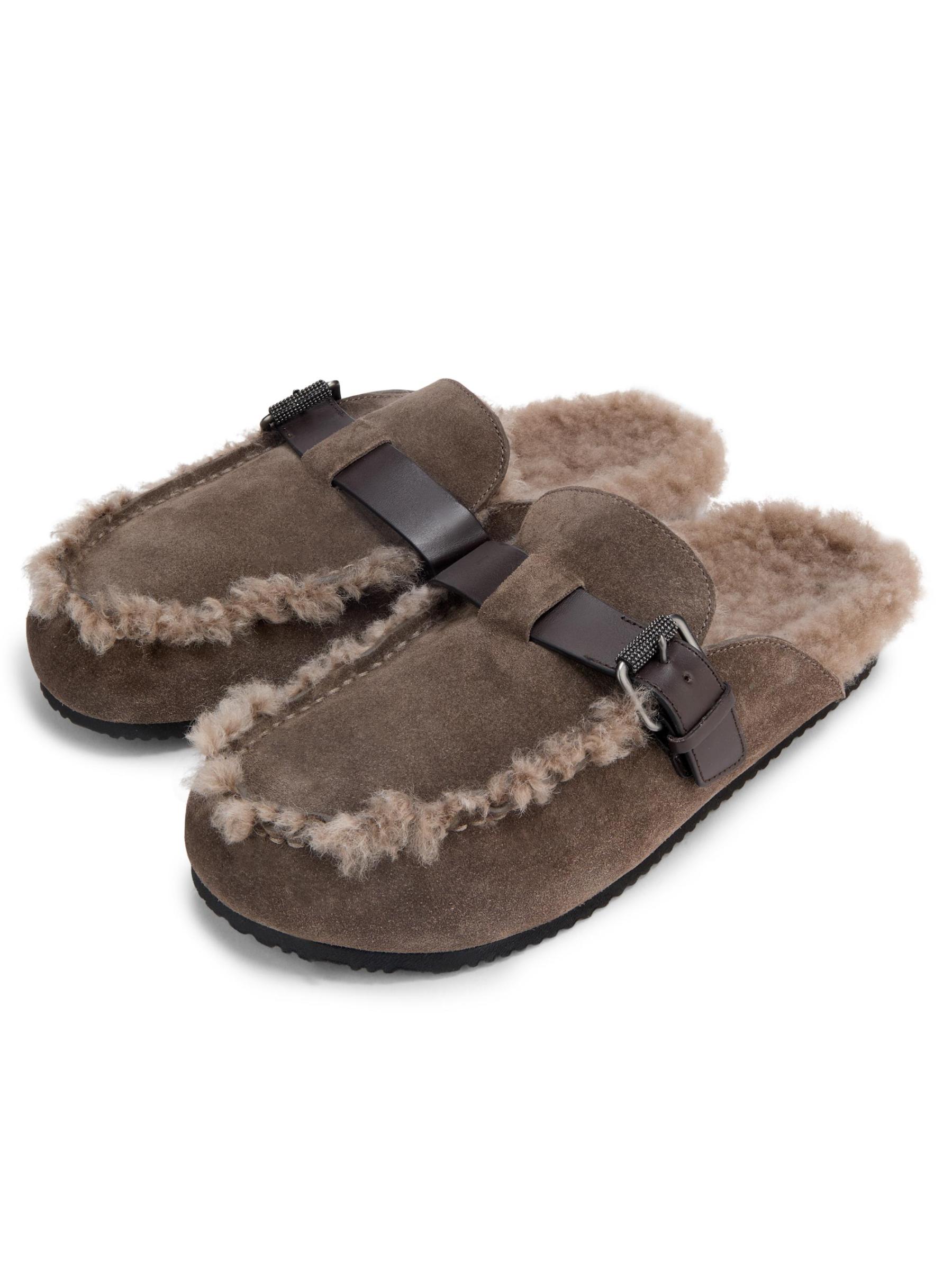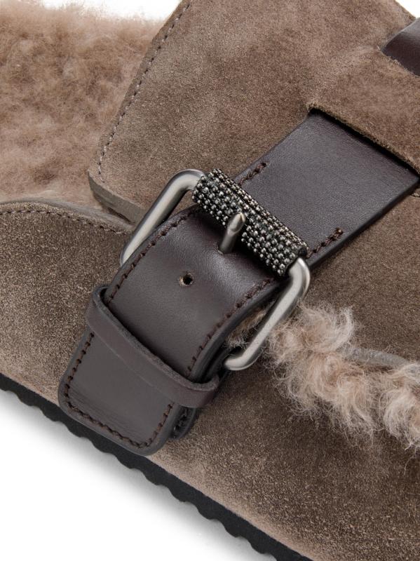 Brunello Cucinelli's mules, crafted of suede, feature a shiny buckle detail and lush shearling lining and trim.