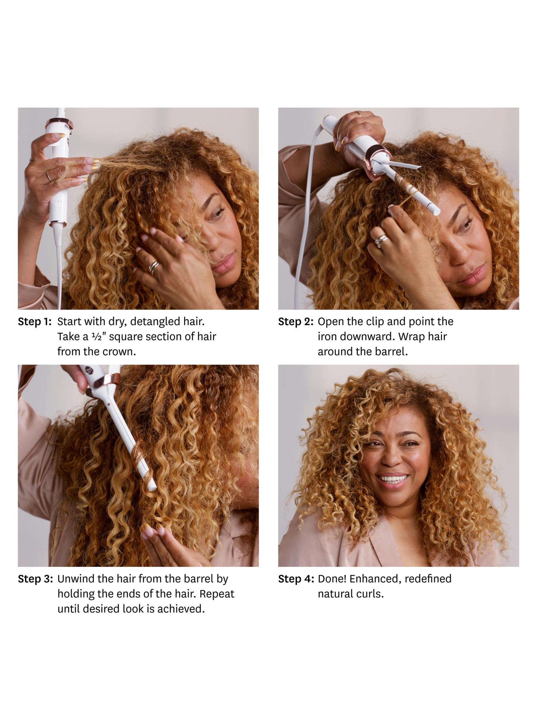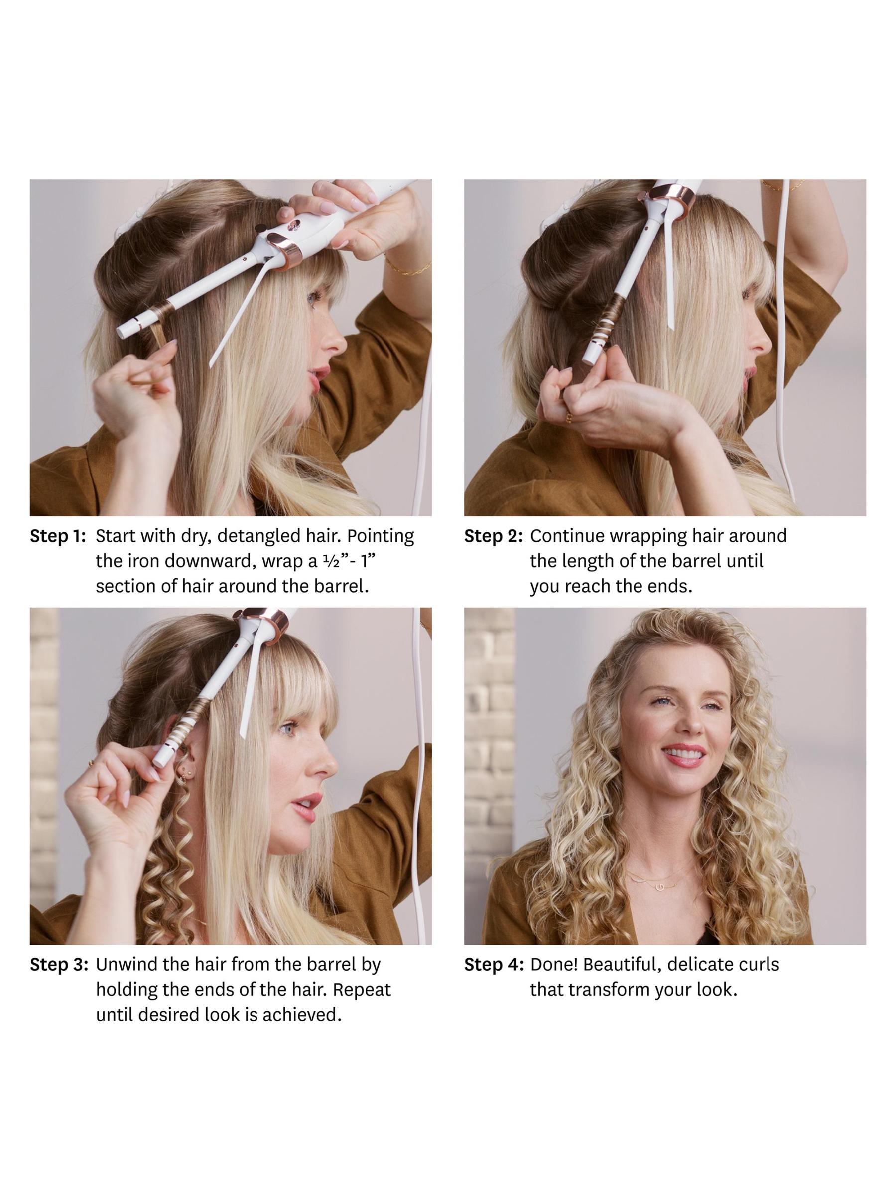 Begin with dry detangled hair. Divide hair at the temples and secure the top half out of the way. Using 1.5-2” sections of hair, secure the ends of a section underneath the clamp and roll upwards, wrapping the hair evenly around the barrel. Hold for a few seconds, then release the clamp. For loose, wavy curls, tug slightly on the section before allowing it to cool.