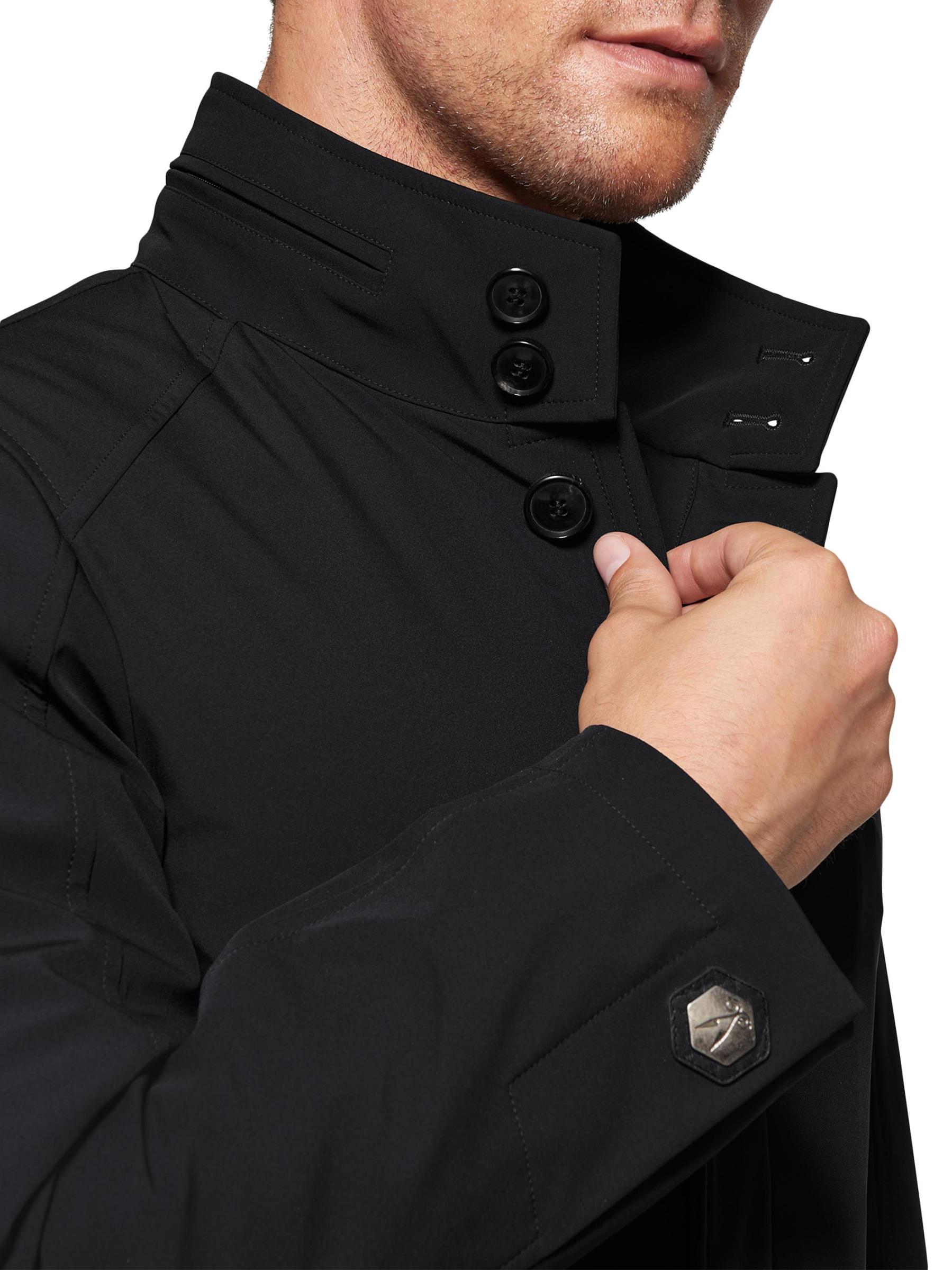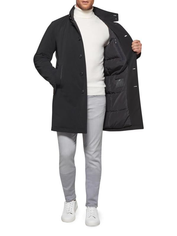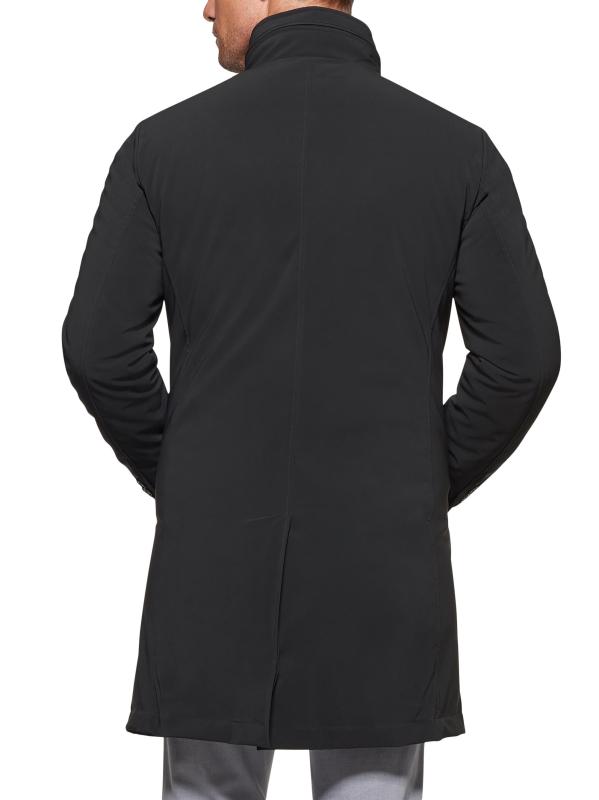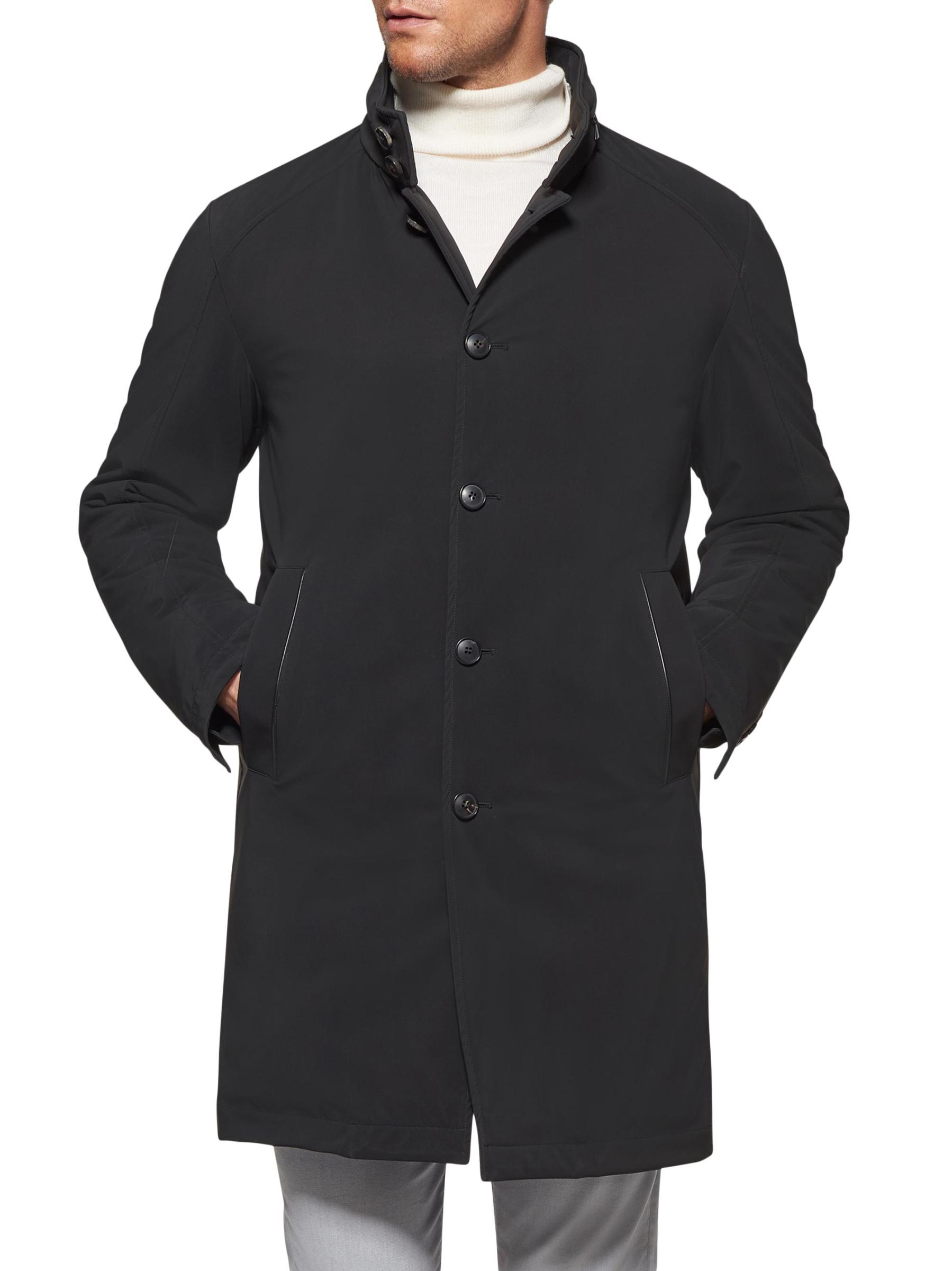 Norwegian Wool's longline trench coat is designed with a stand collar and multiple pockets, offering a sleek slim fit.Hideaway hood Stand collar Long sleeves button cuffs Side welt pockets Interior pockets Button front placket 51% polyamide/42% polyester/7% elastane Fill: 90% down/10% feathers Dry clean Made in Italy