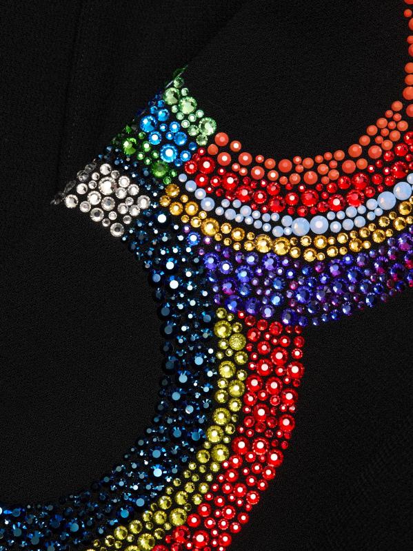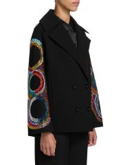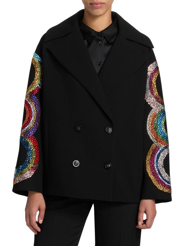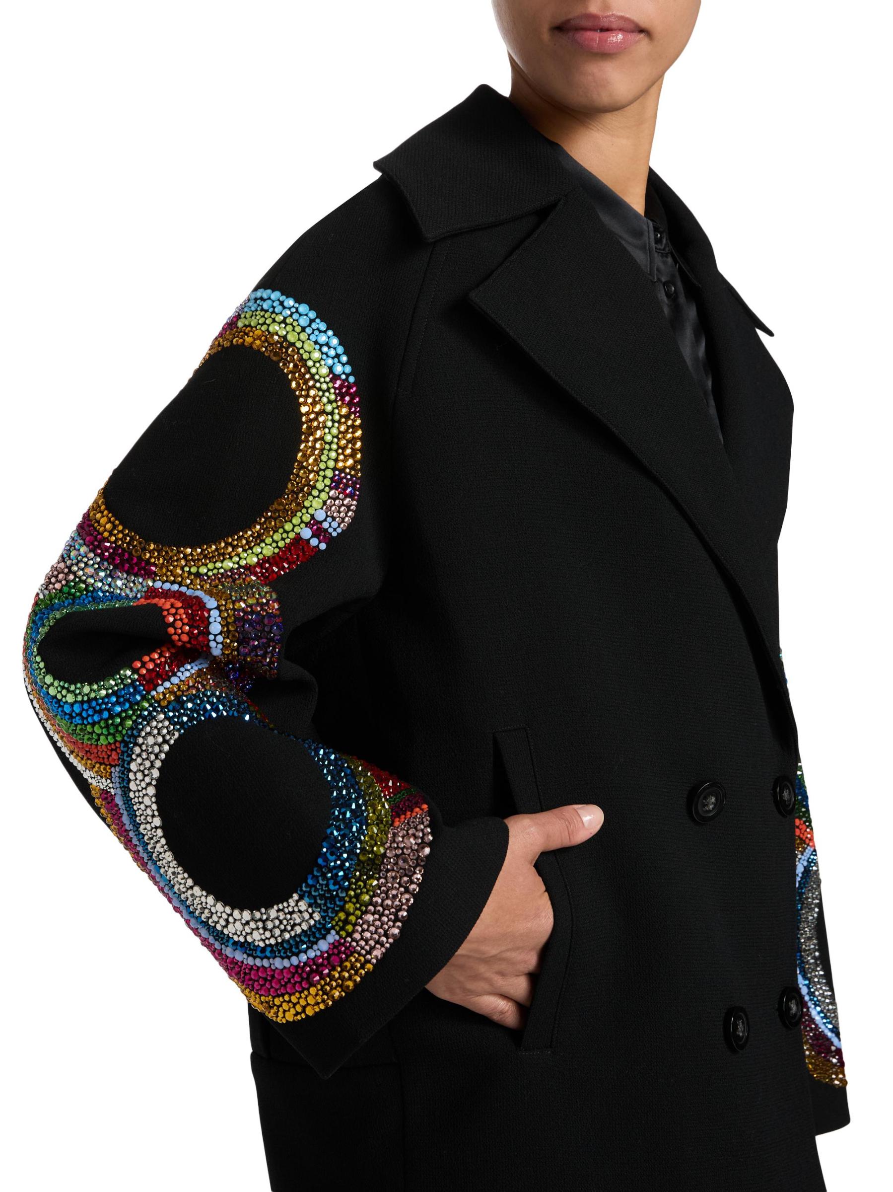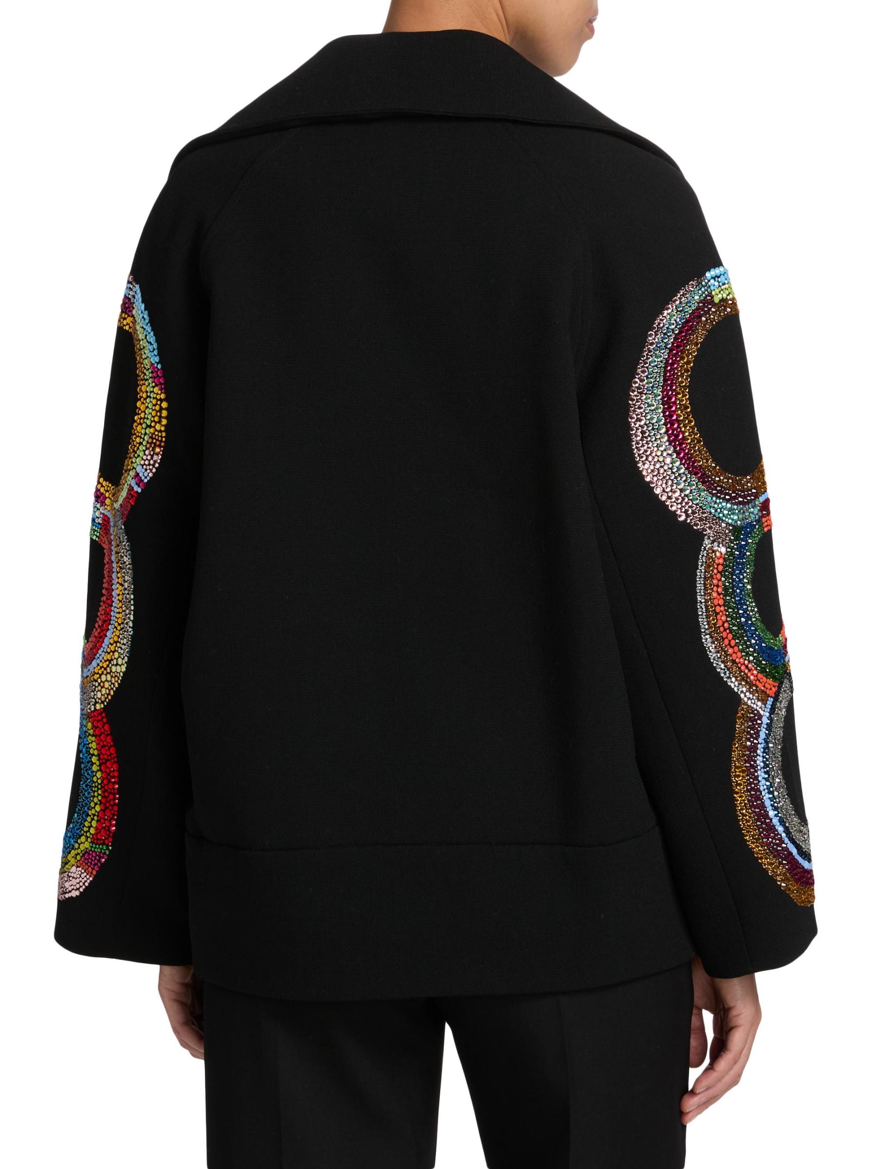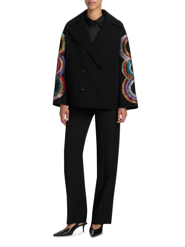 Crafted of a stretch wool blend, this Sonia Deauville jacket from Libertine is embellished with sparkling rainbow crystals in a geometric design at the sleeves.