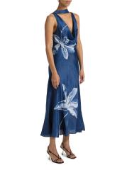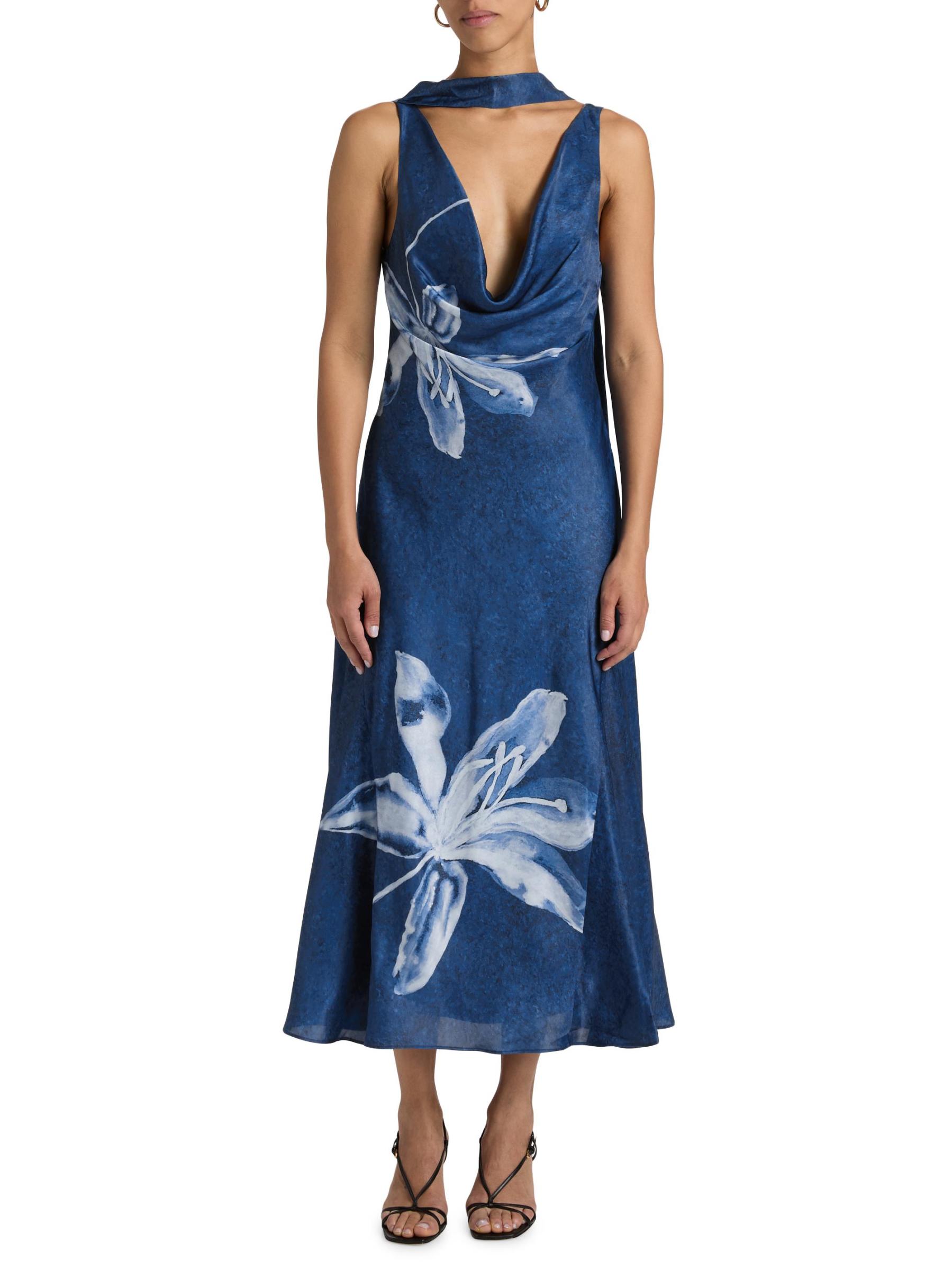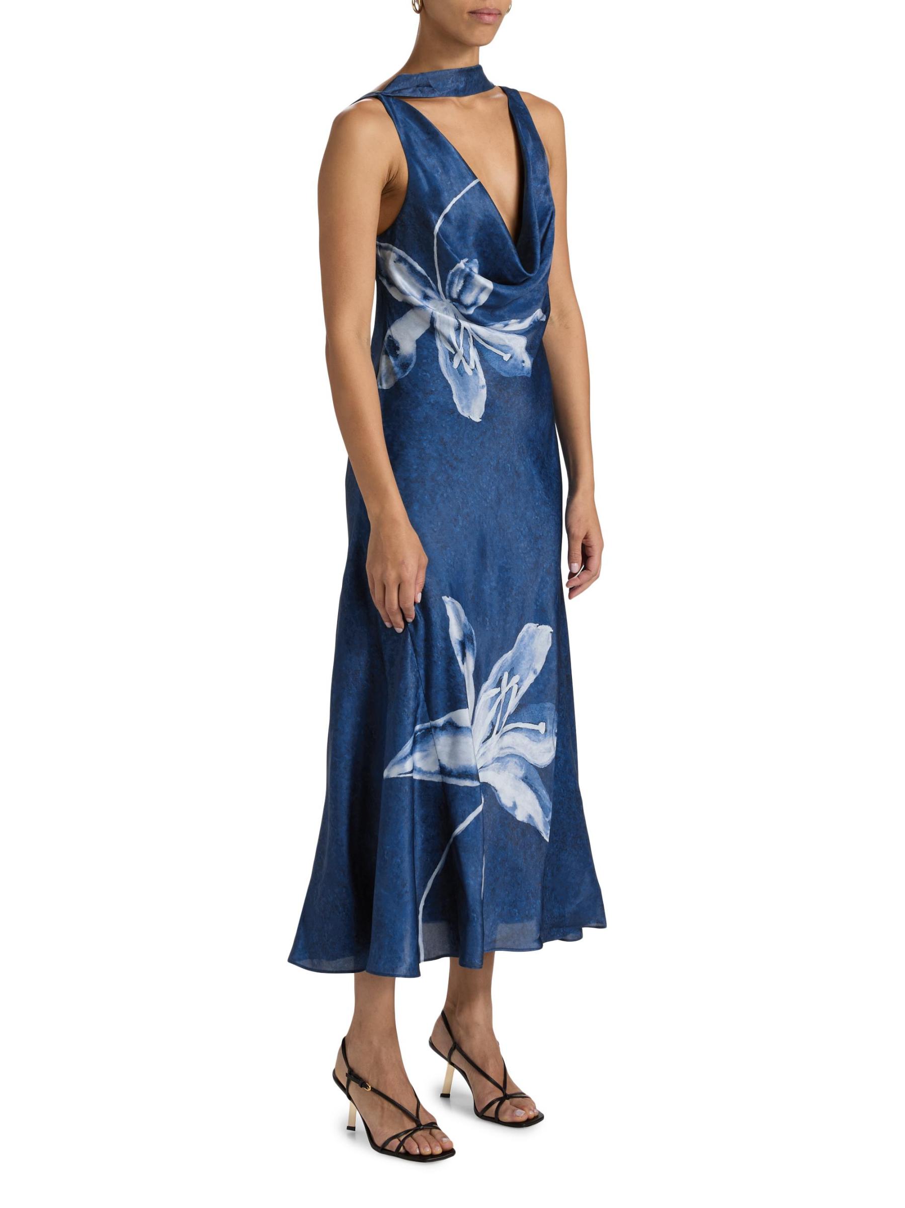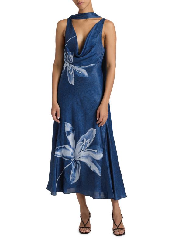 Amur's Sorelle midi-dress features a draped cowl neck, scarf detail, and backless silhouette, finished with placed florals.
