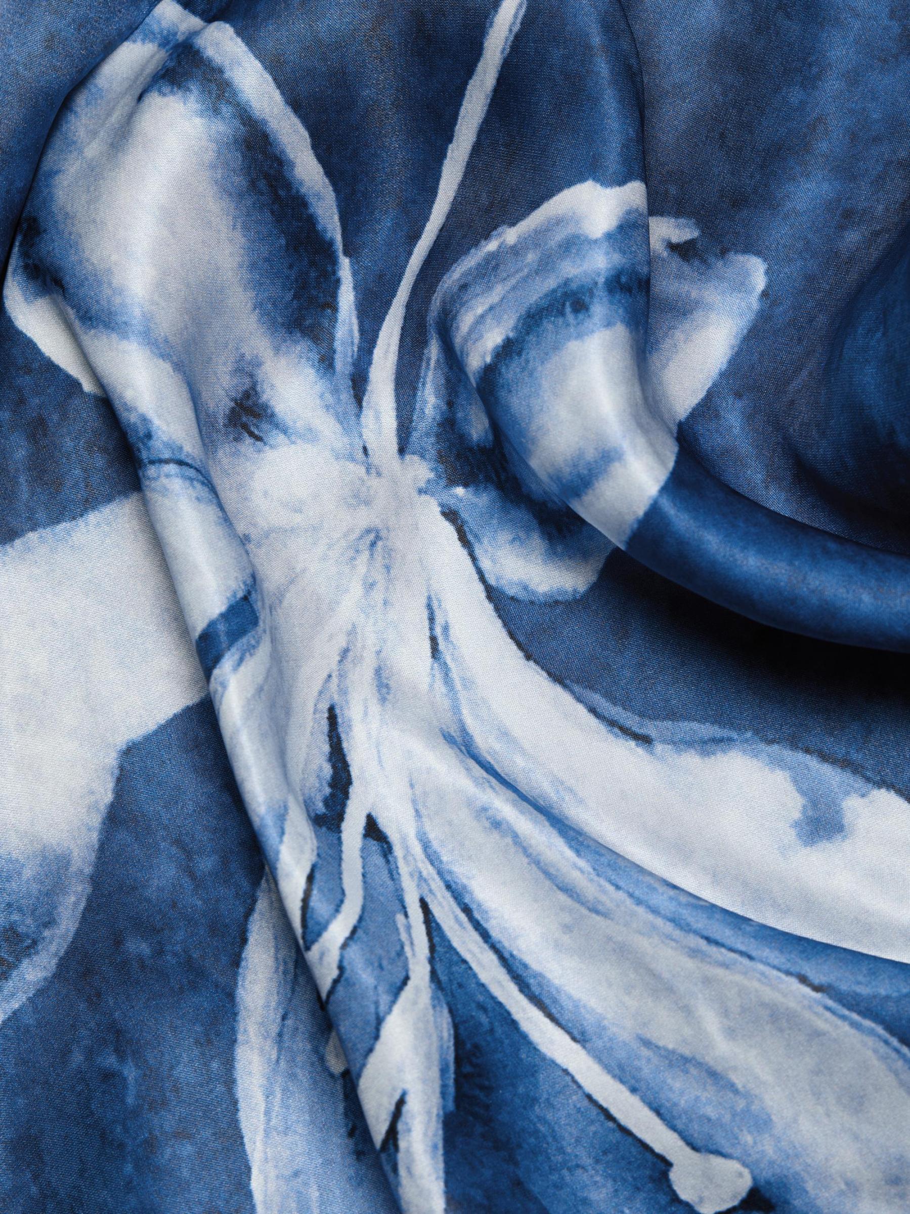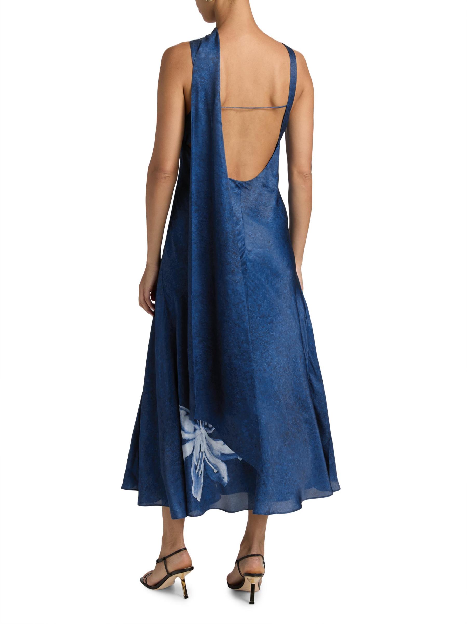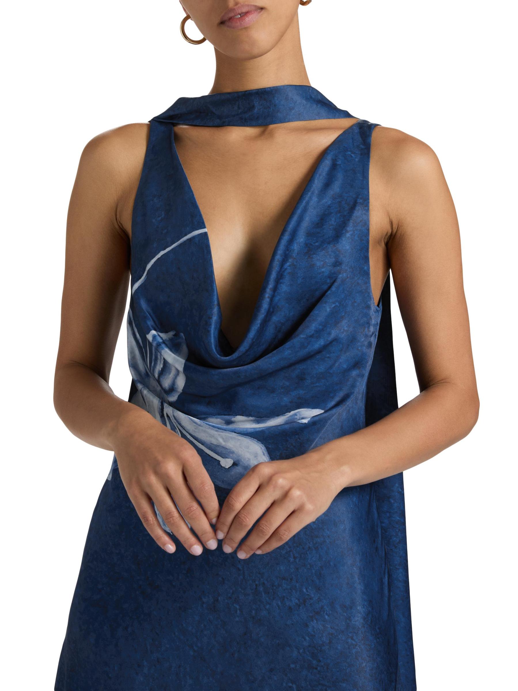 Amur's Sorelle midi-dress features a draped cowl neck, scarf detail, and backless silhouette, finished with placed florals.