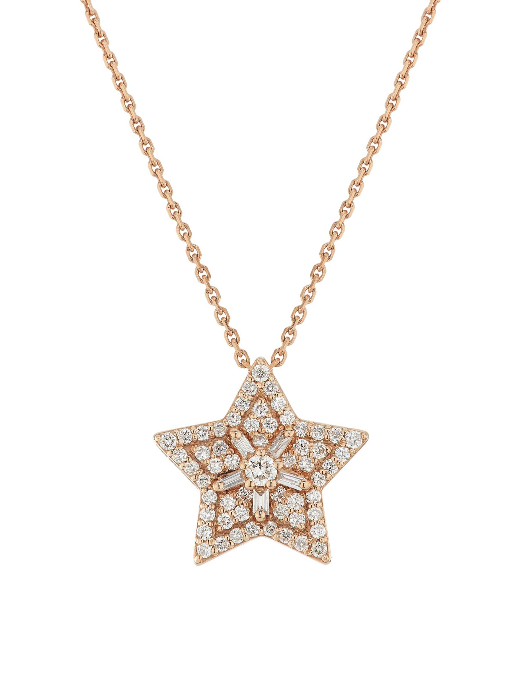 From the Star Light Collection. Crafted of 14K rose gold, Bee Goddess' Sirius necklace features a star pendant encrusted with glittering pavé and baguette diamonds.