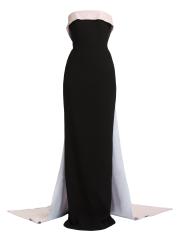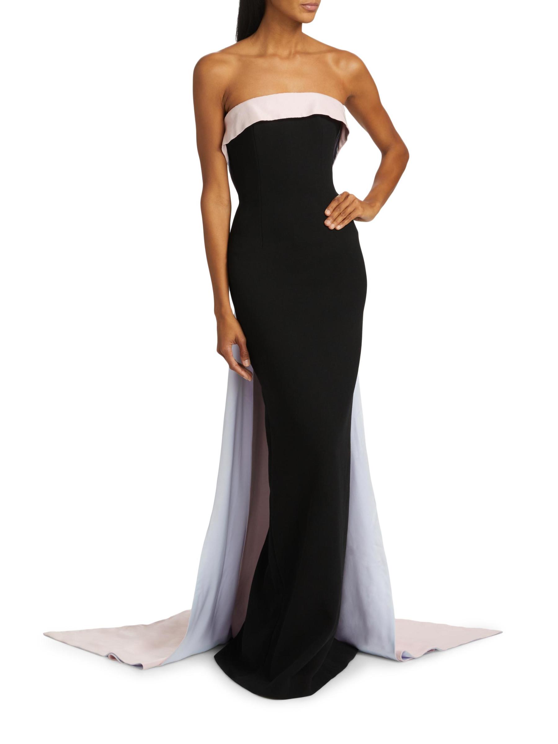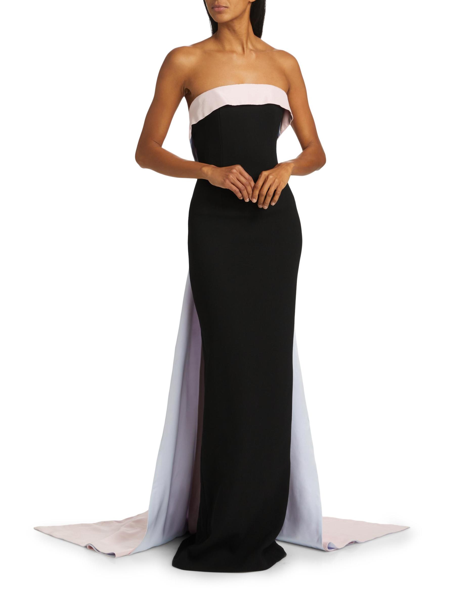 Made in the USA, Sergio Hudson’s strapless gown is crafted of Italian stretch-crepe and features a floor-length train at the back.