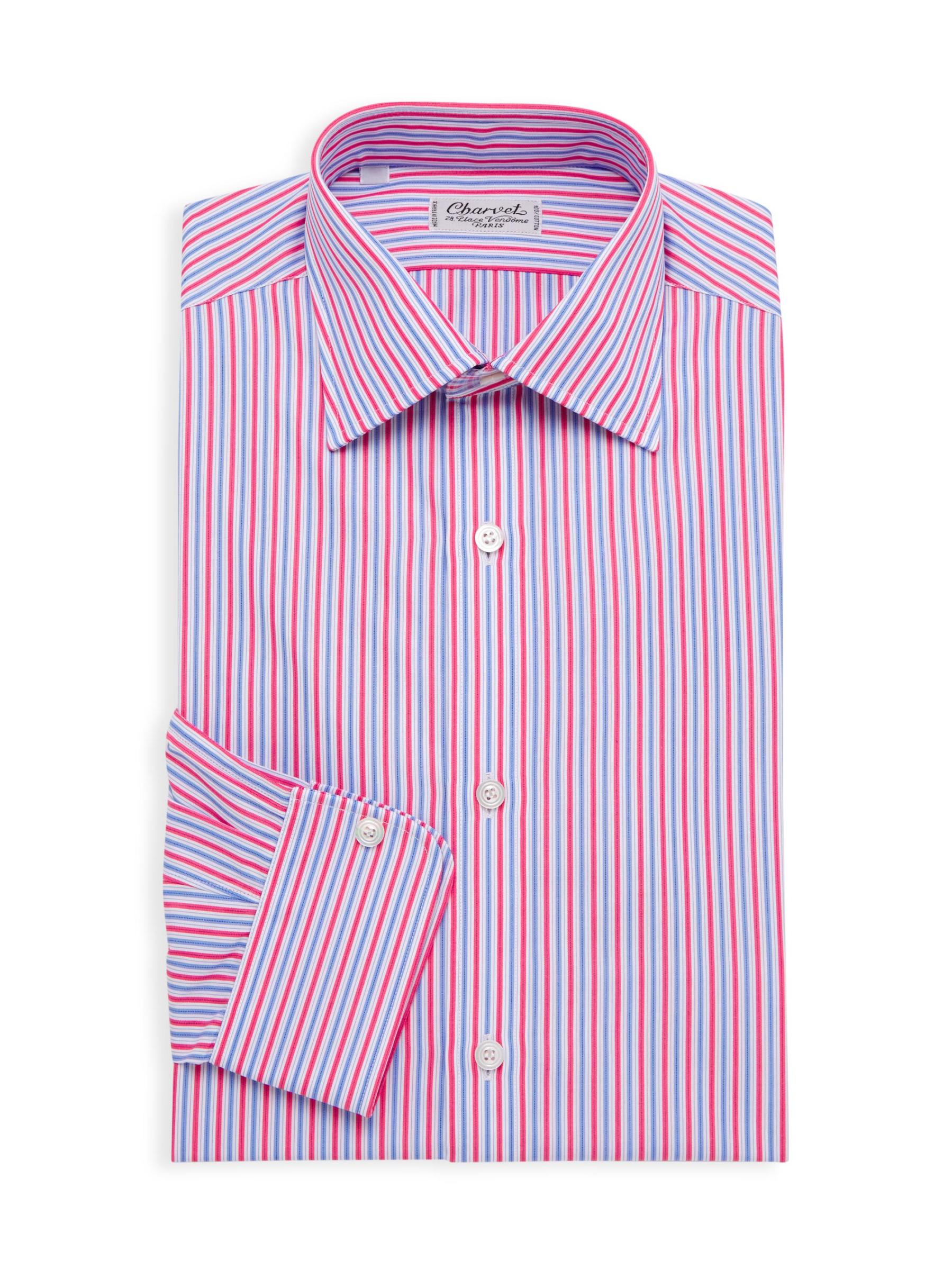 This Charvet dress shirt is crafted of crisp cotton chambray and styled with bold stripes.Classic collar Long sleeves button cuffs Button front closure 100% Cotton Machine wash Made in France