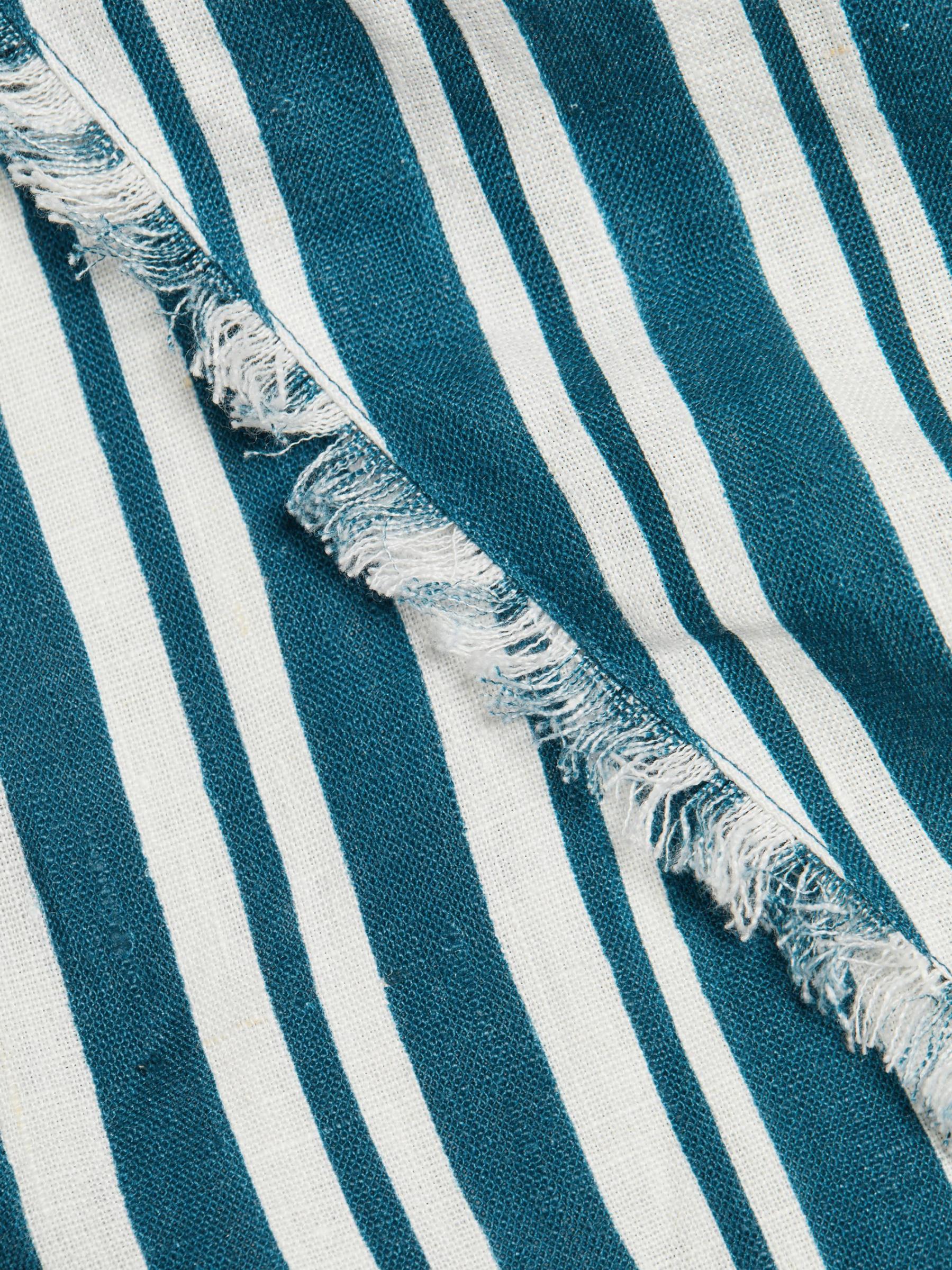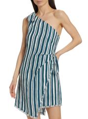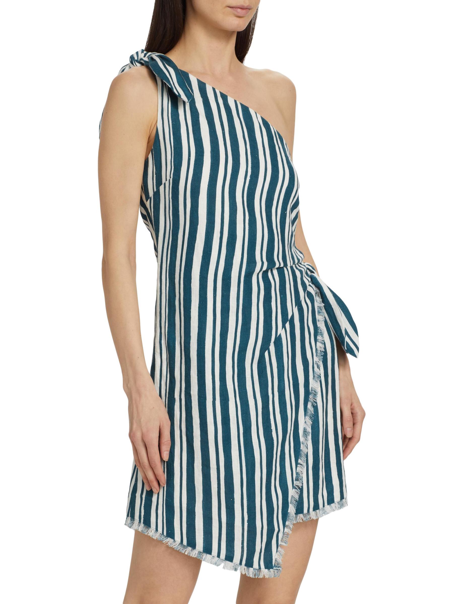 Crafted of a striped linen and cotton blend, Simon Miller’s one-shoulder minidress is designed with a raw-cut, staggered hem and side tie.