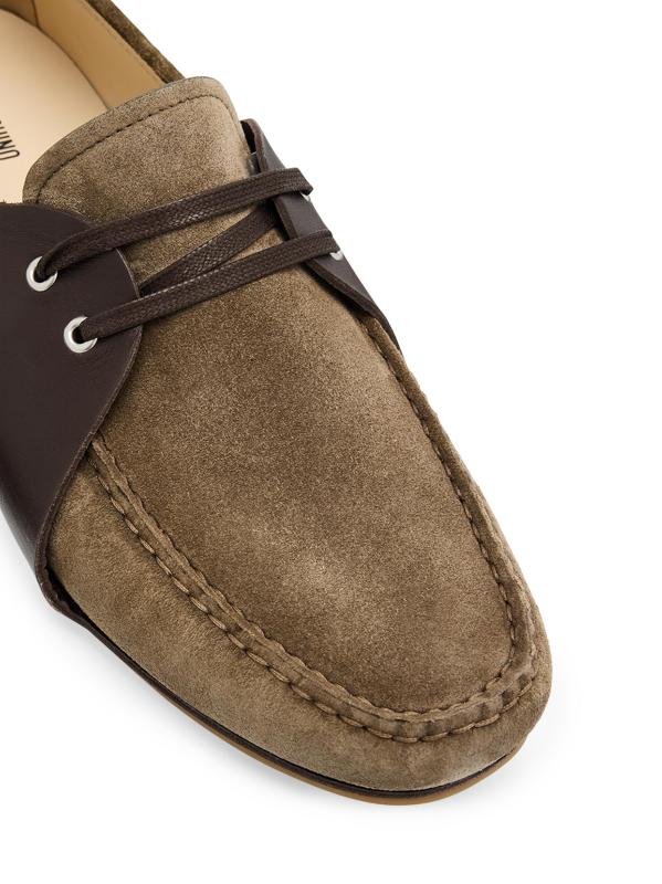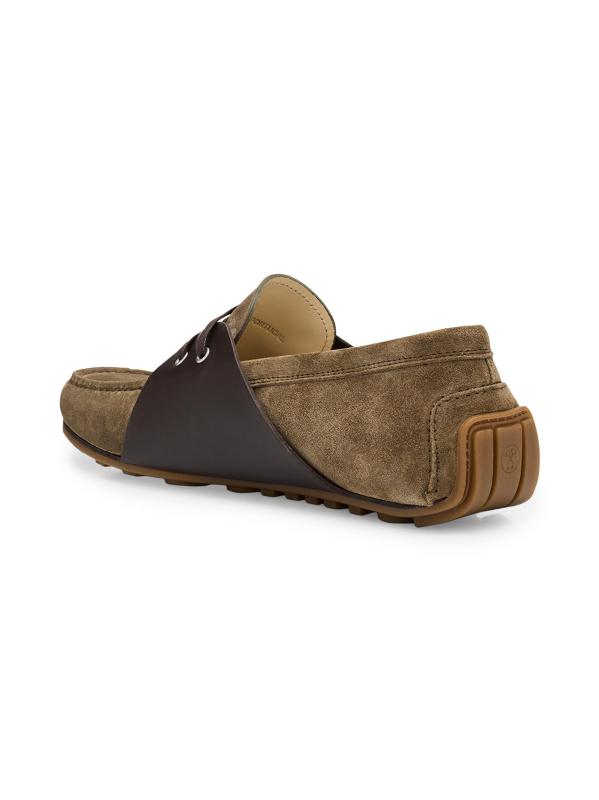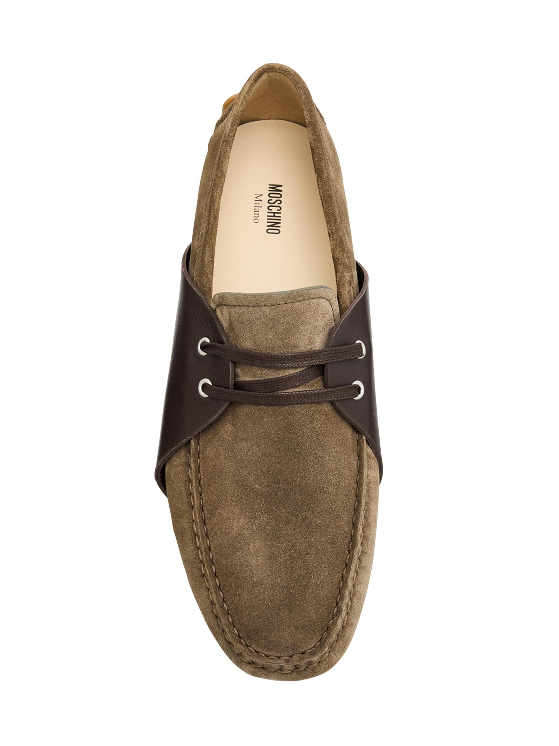 Crafted of soft suede with smooth leather overlays, these Moschino driving loafers feature a classic moccasin-inspired lace-up design with a pebbled rubber sole.