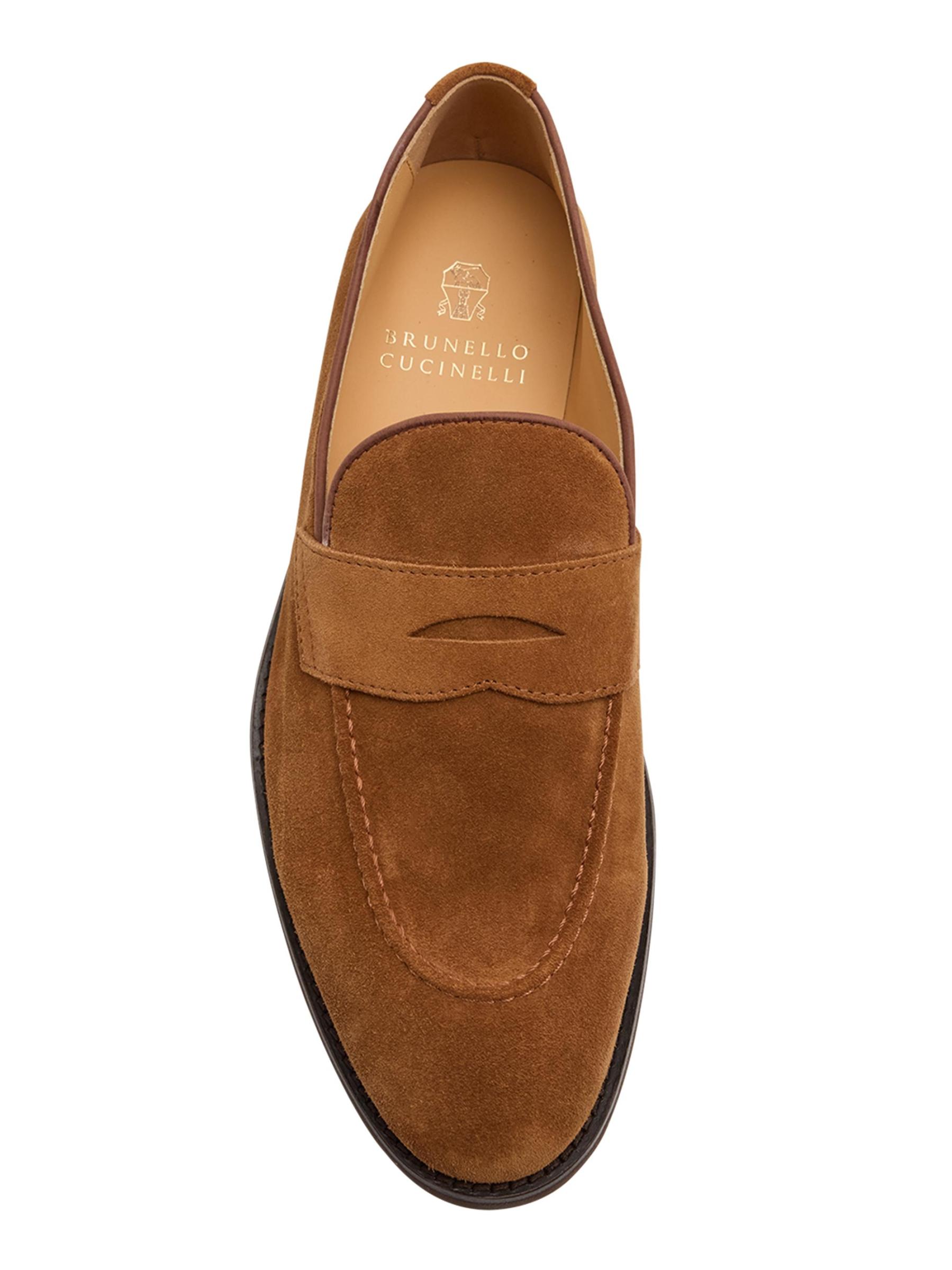 These Brunello Cucinelli loafers are crafted of suede with a round apron toe and classic penny keeper strap. Made in Italy, this pair is finished with a stacked leather sole.