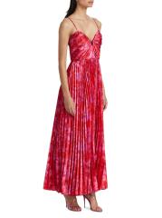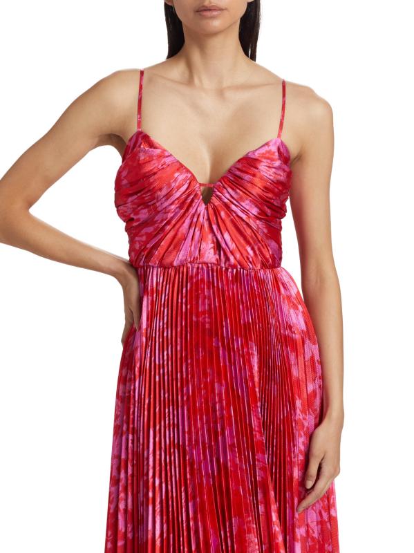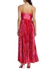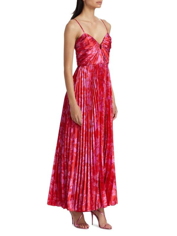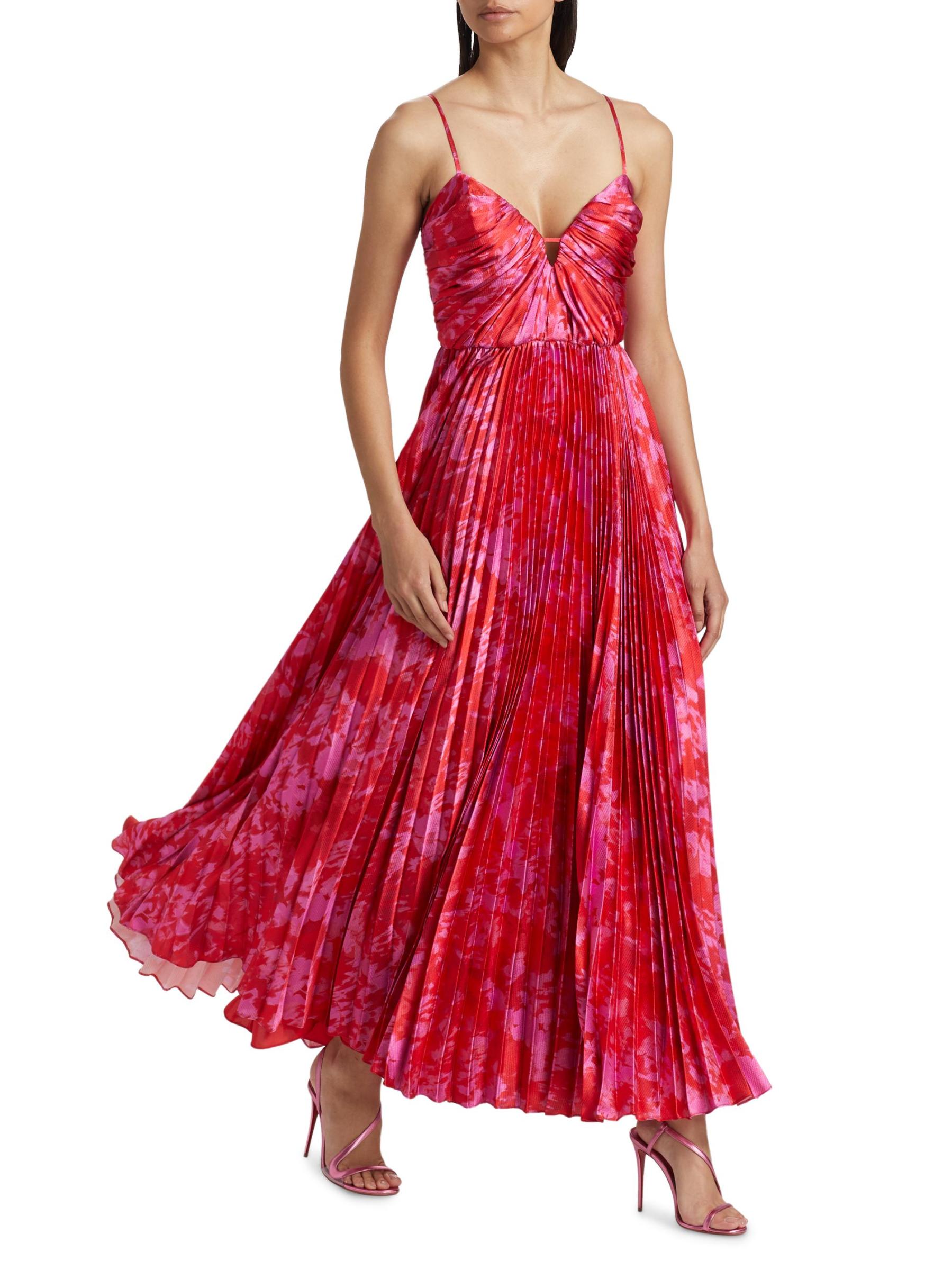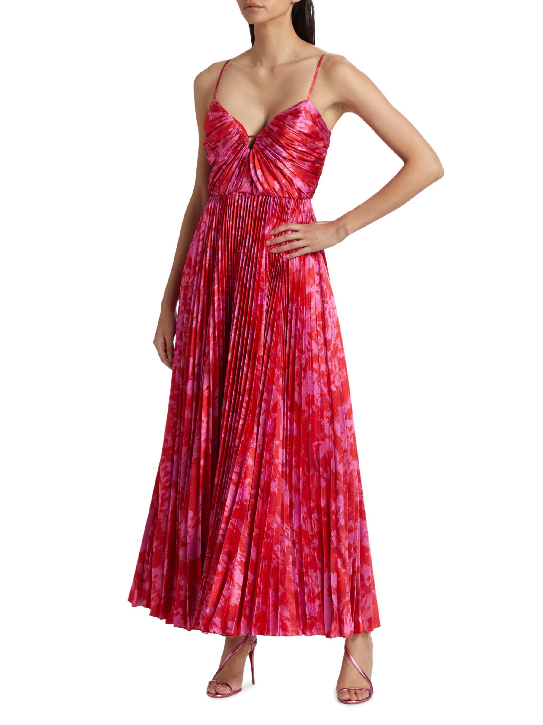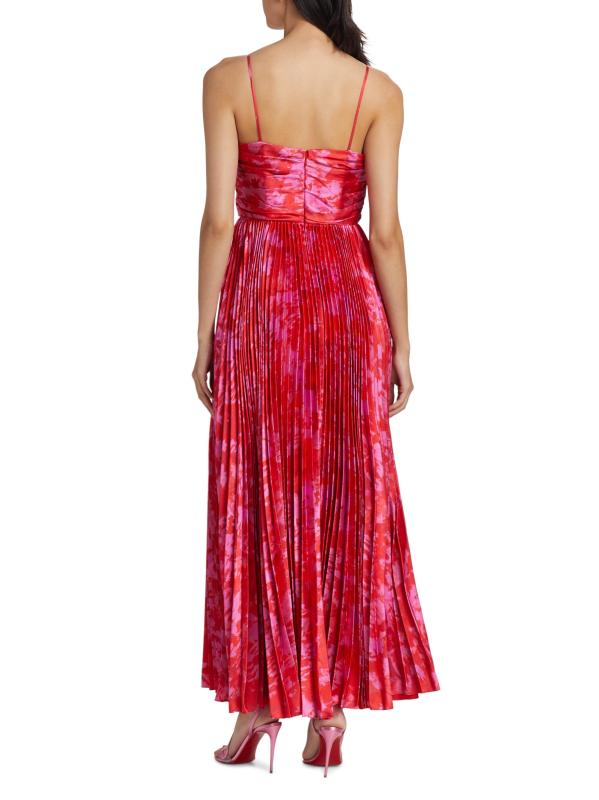 Crafted of hammered satin, the abstract print Suzette maxi dress from ML Monique Lhuillier is styled with a ruched bodice and a pleated skirt.