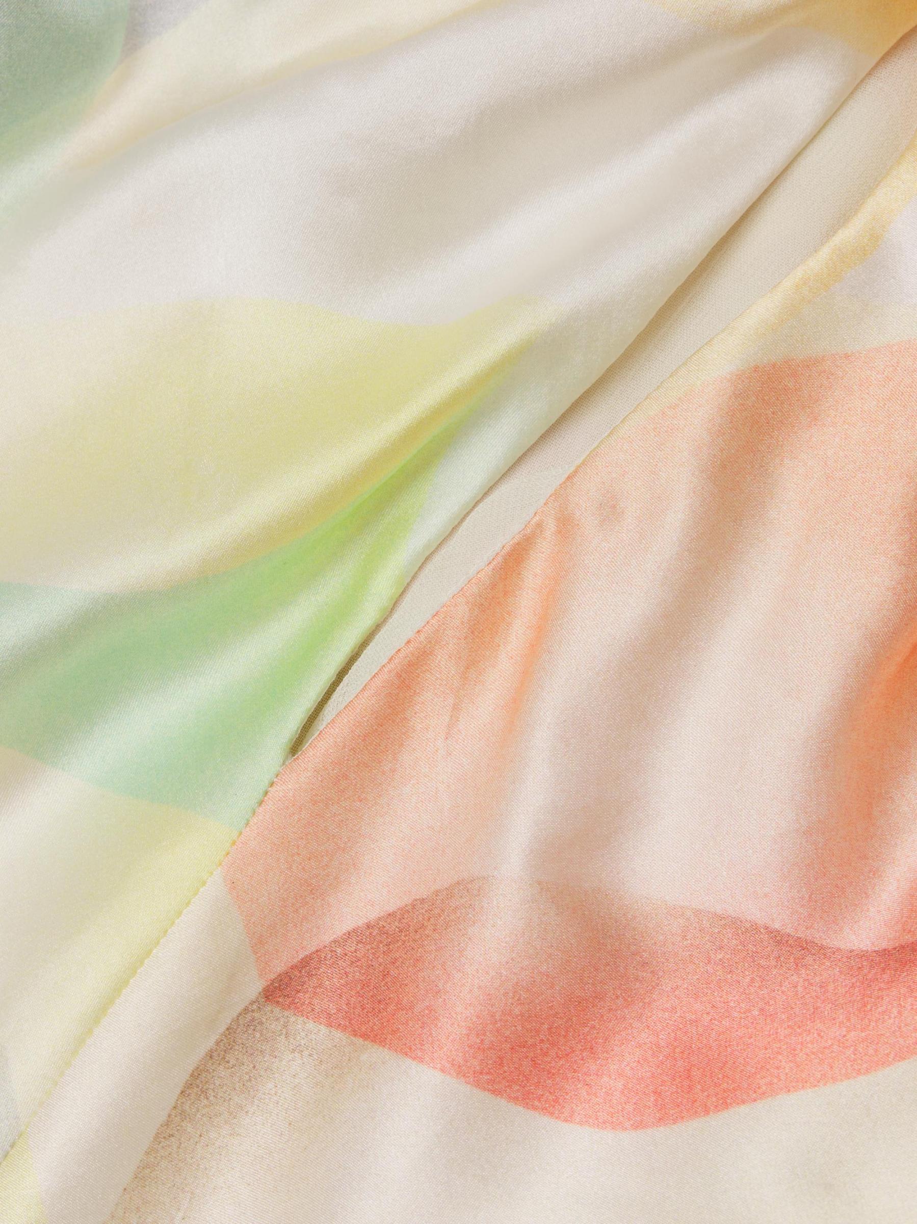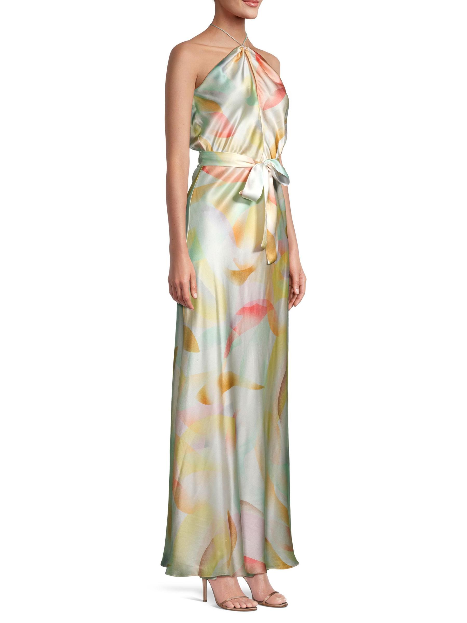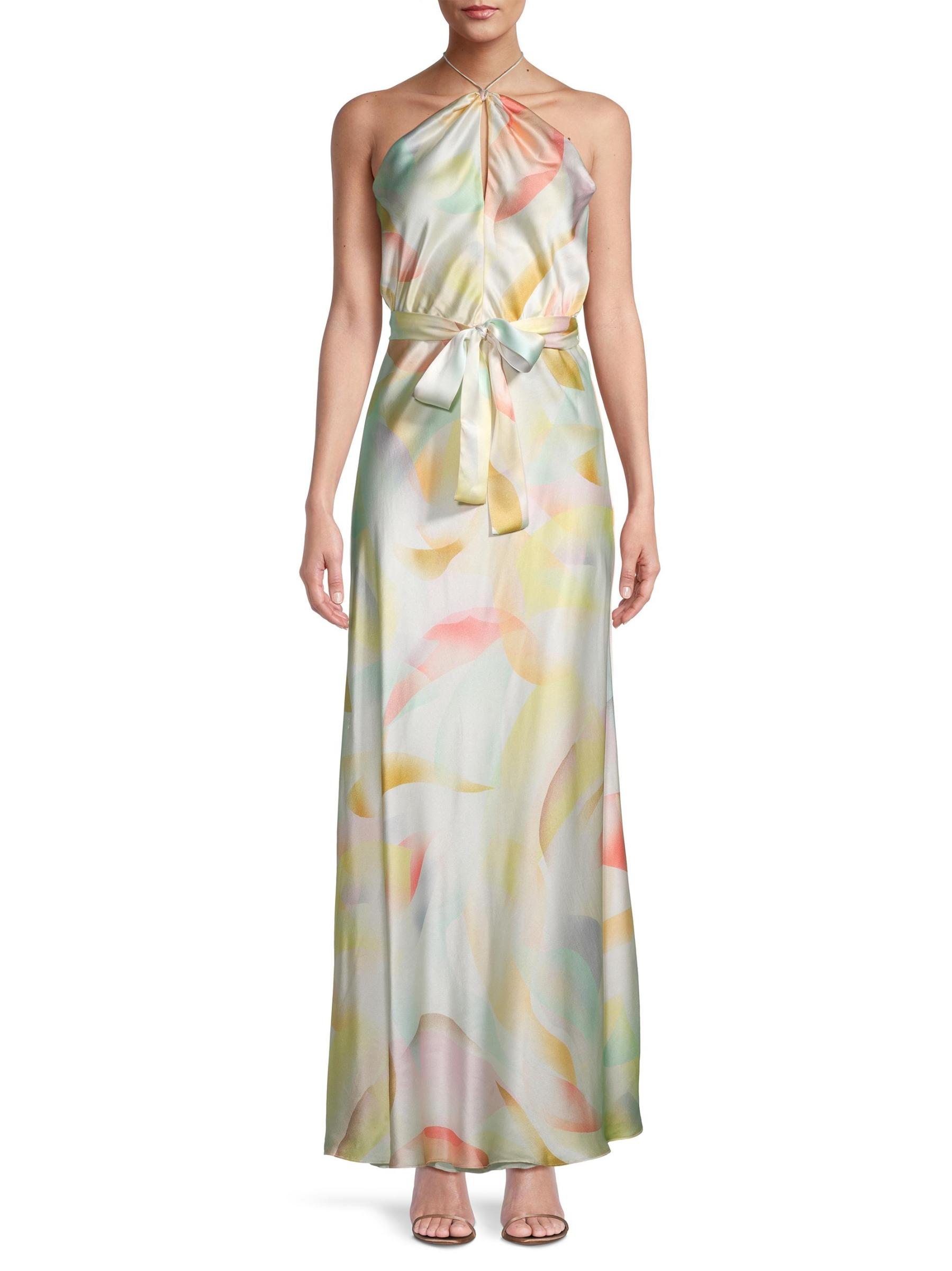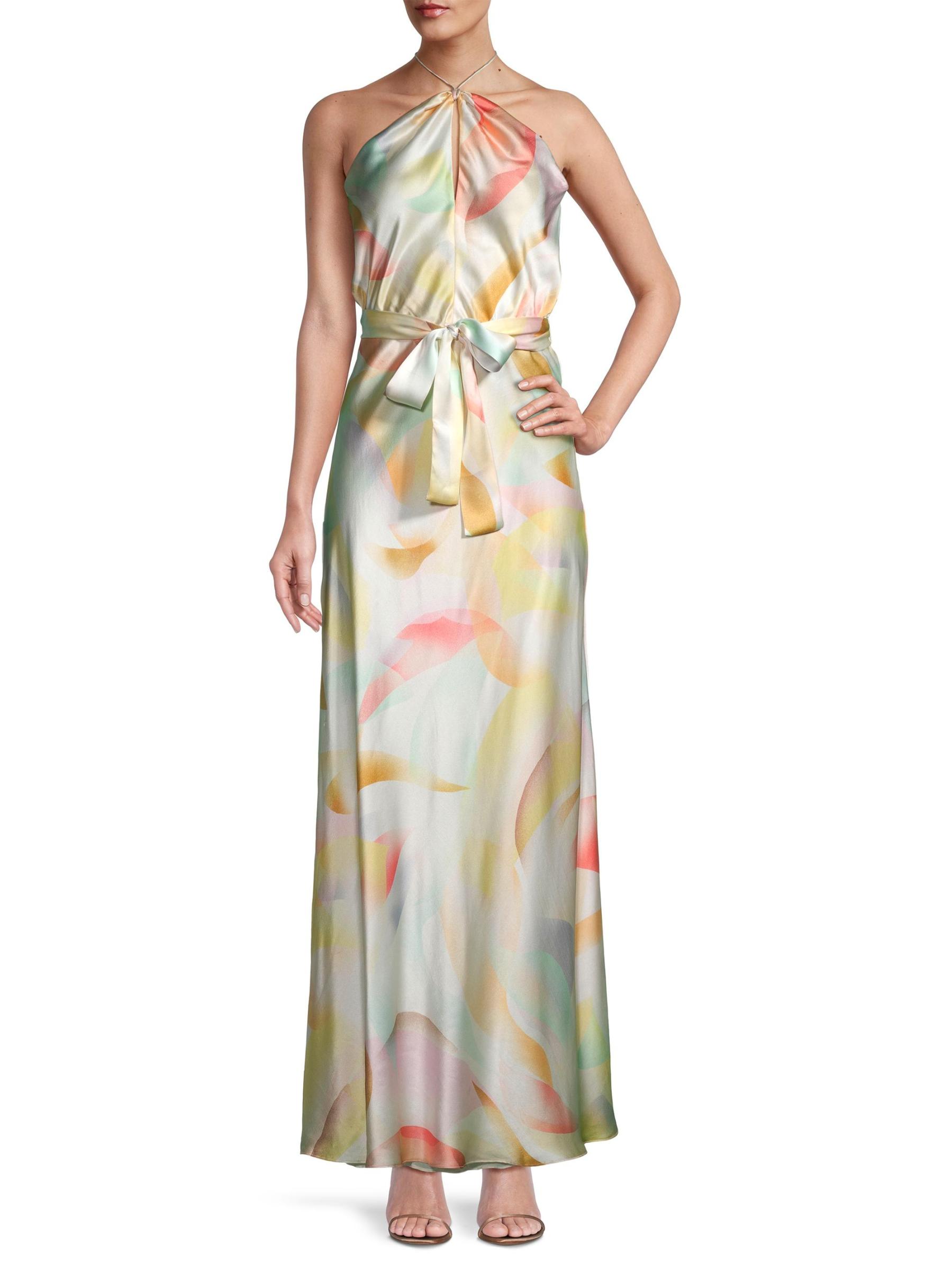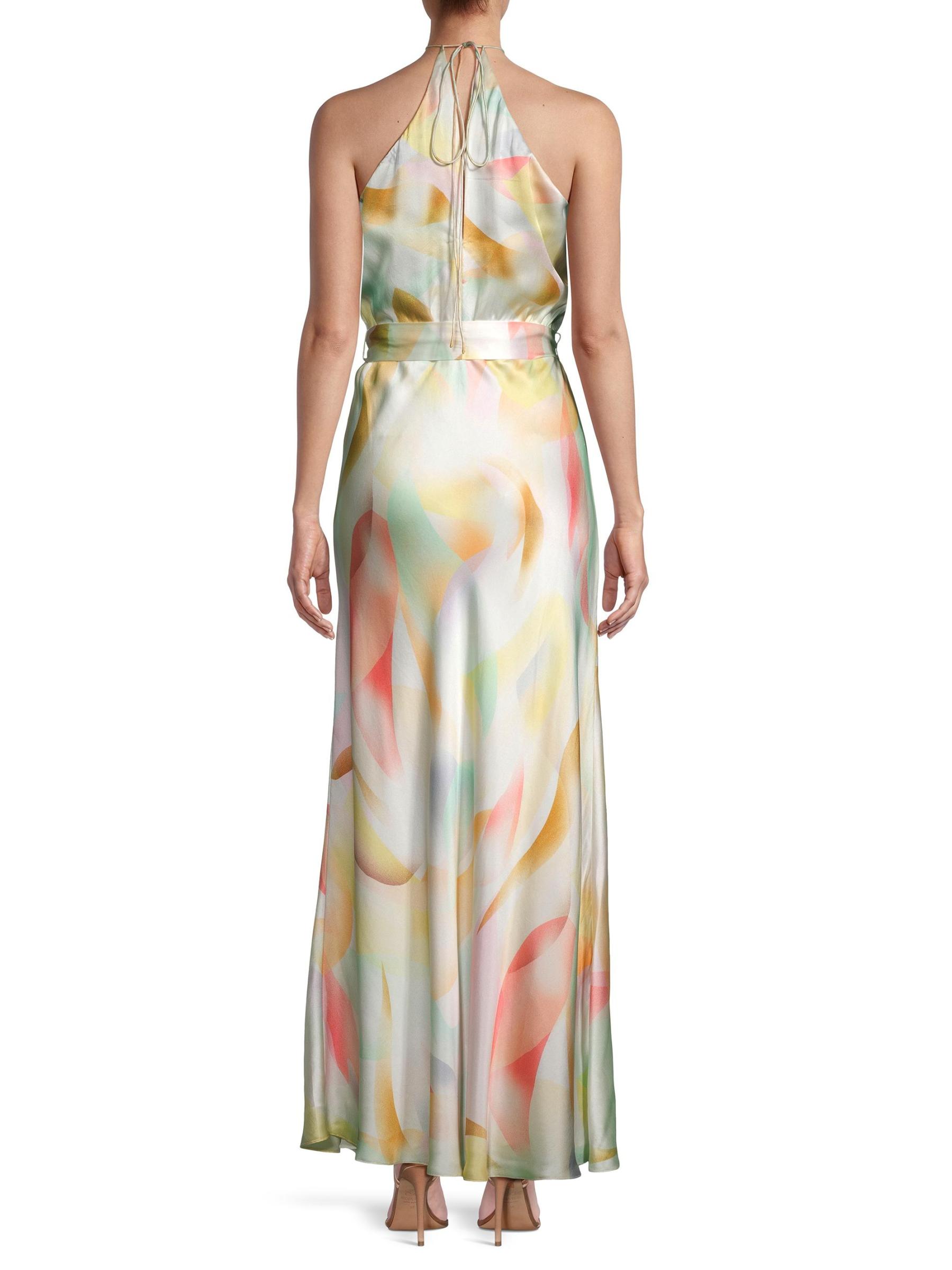 Smart flaunts a swirilng abstract geometric print. This maxi style features an optional waist belt for a fitted silhoette, a halterneck with fine straps and back keyhole detail for a hint of elegance.Halterneck Sleeveless Removable self-tie belt Back tie closure 100% Silk Hand wash Imported