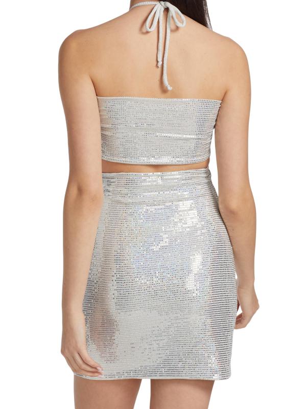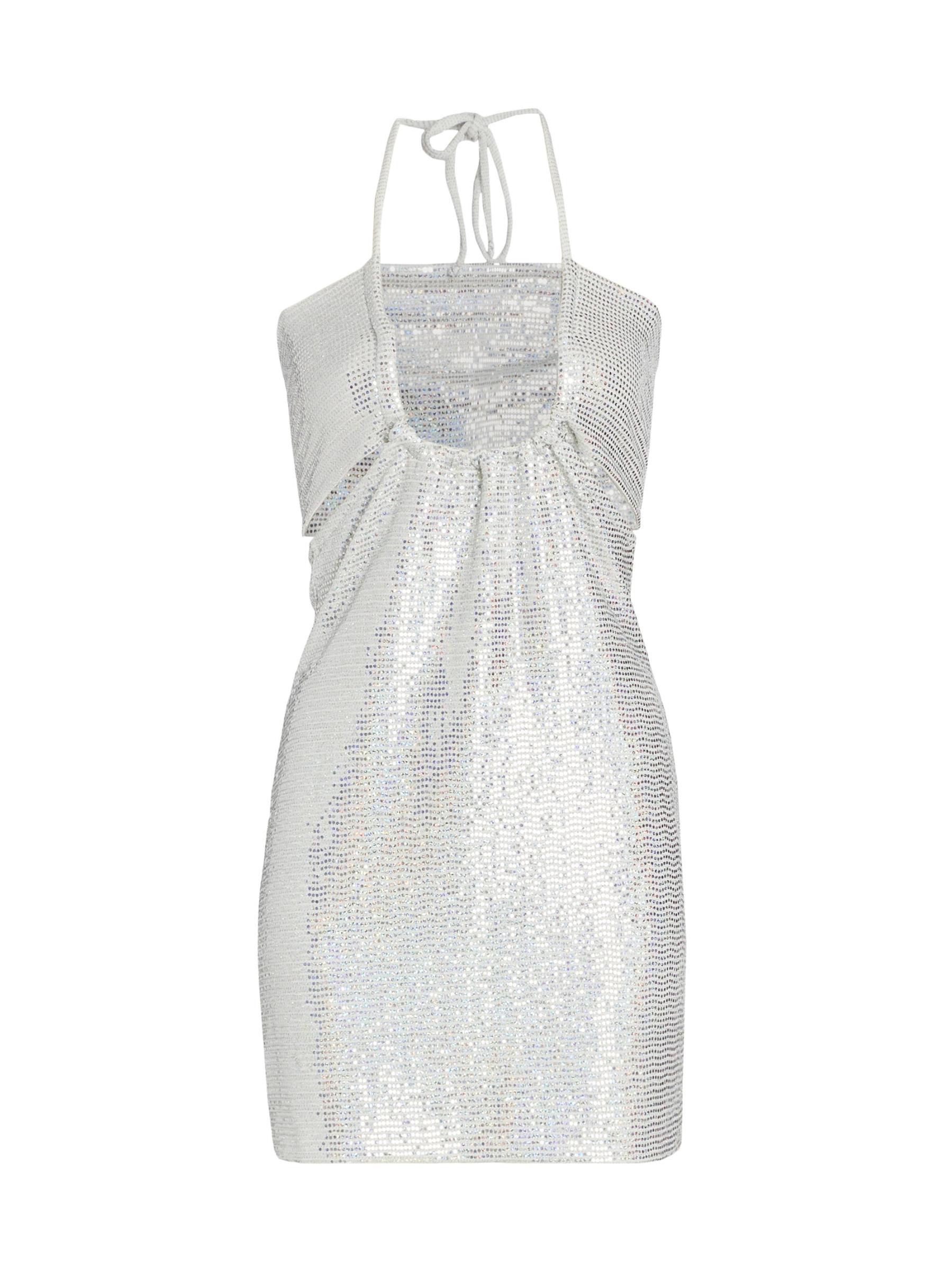 Made of metallic fabric, this minidress is designed with a plunging halter neck and cut-out details at the sidesPlunging neckline Sleeveless Tie neck 100% polyester Dry clean Imported
