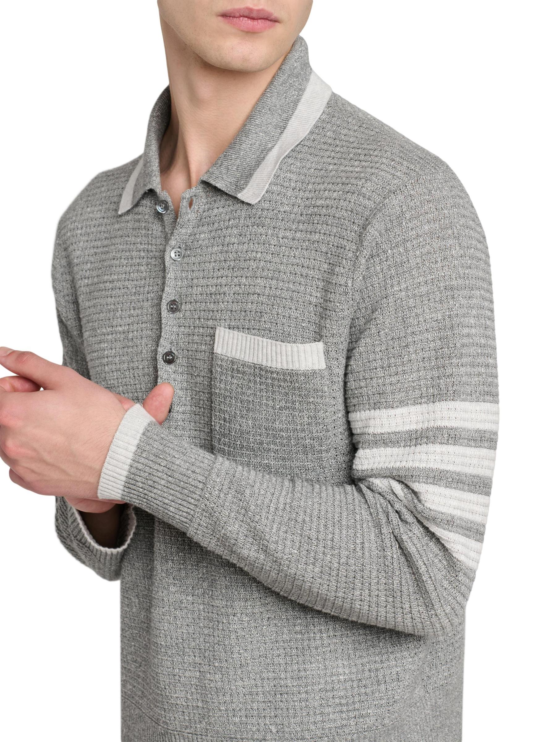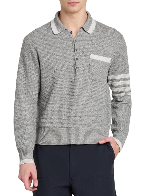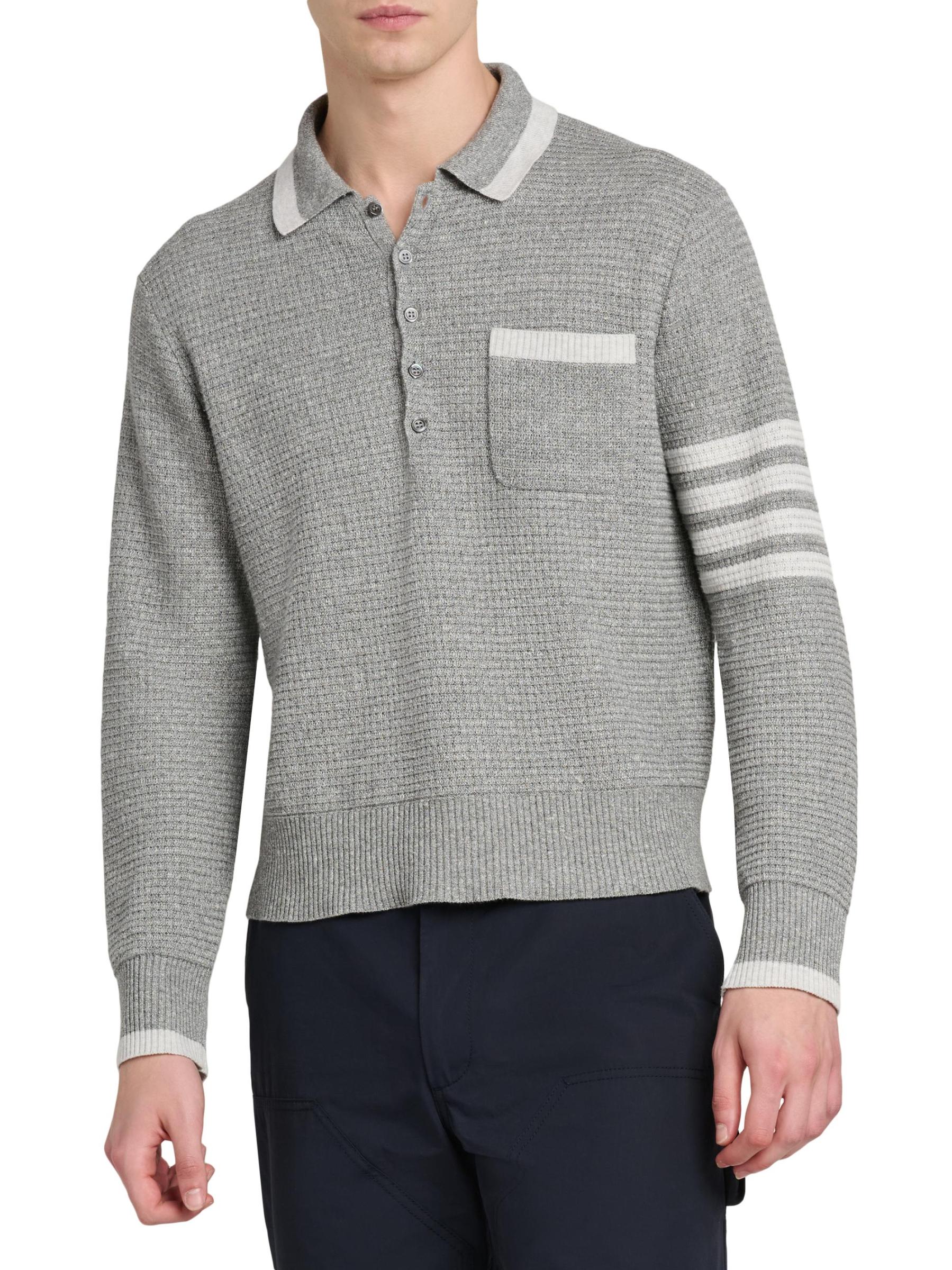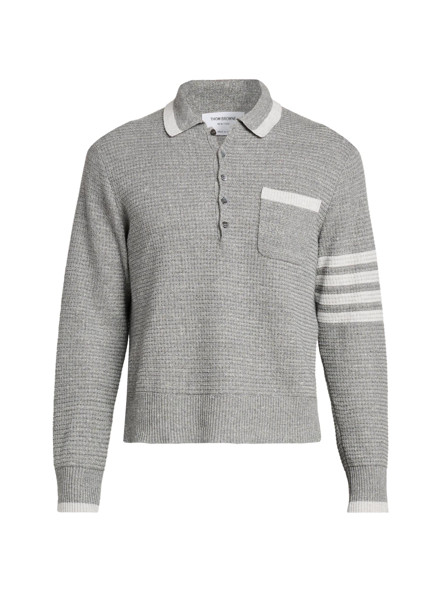 This polo shirt from Thom Browne is crafted of linen and cotton knit and features the signature 4-bar stripe at the sleeve. This style is designed with a relaxed fit.Spread collar Long sleeves, ribbed cuffs Ribbed hem Button front closure 68% linen/32% cotton Dry clean Made in Italy
