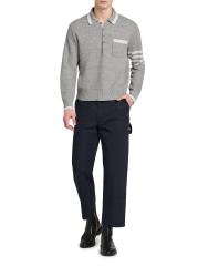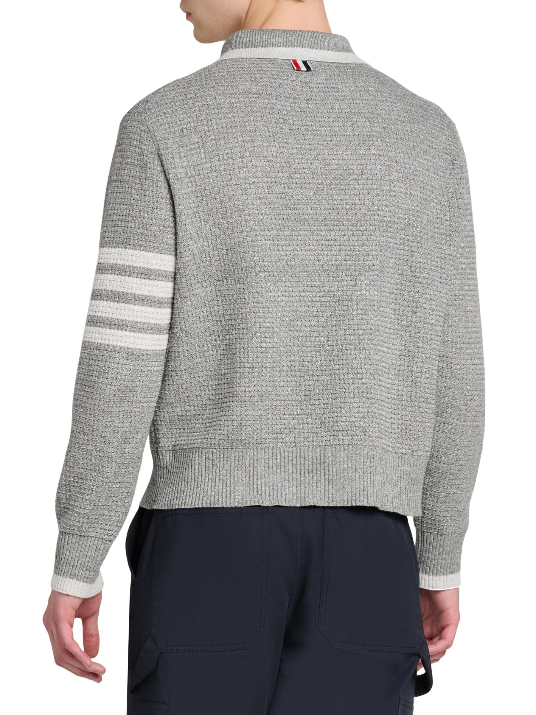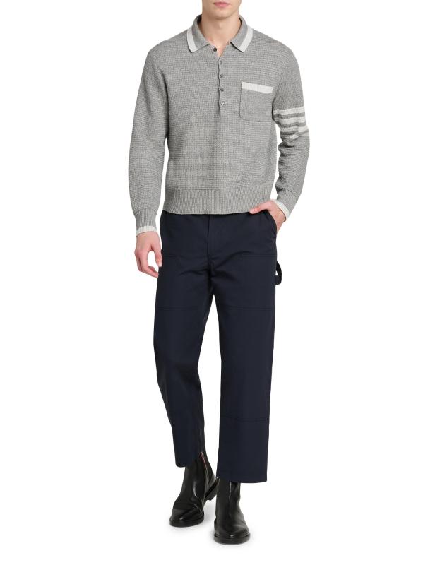 This polo shirt from Thom Browne is crafted of linen and cotton knit and features the signature 4-bar stripe at the sleeve. This style is designed with a relaxed fit.