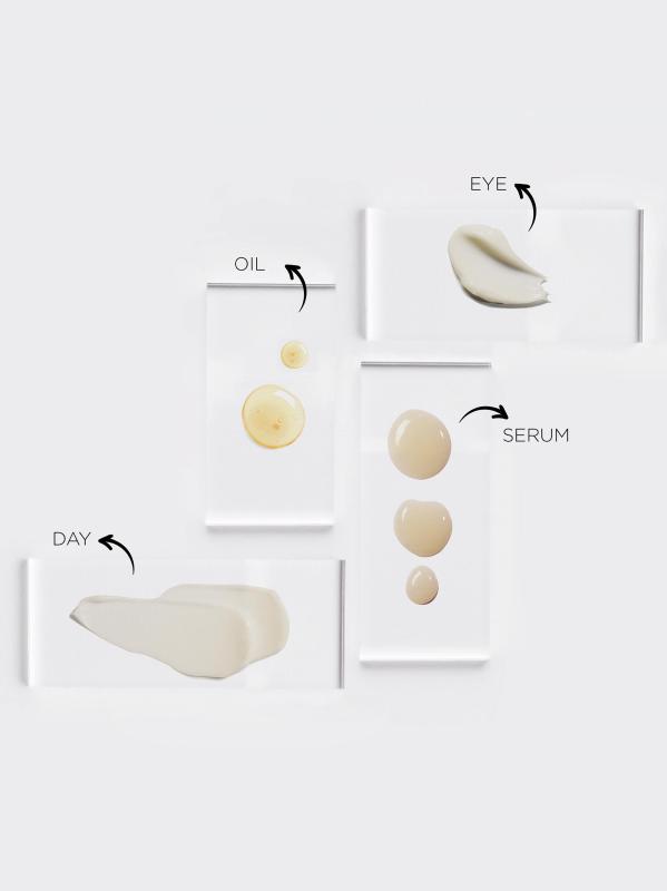 Step 1: SERUM: Apply in the morning to cleansed, dry skin. Gently massage into the face, neck and decolletage in upward and outward motions. Step 2: EYE: gently tap around the entire orbital area, from inner to outer corner, to the temples and below and above the eyes. Step 3: MOISTURIZER: apply in an upwards and outwards motion to the face, neck and decolletage Step 4: OIL: Apply oil to the face, and neck, gently pressing it in, follow with Multi-Defense SPF.