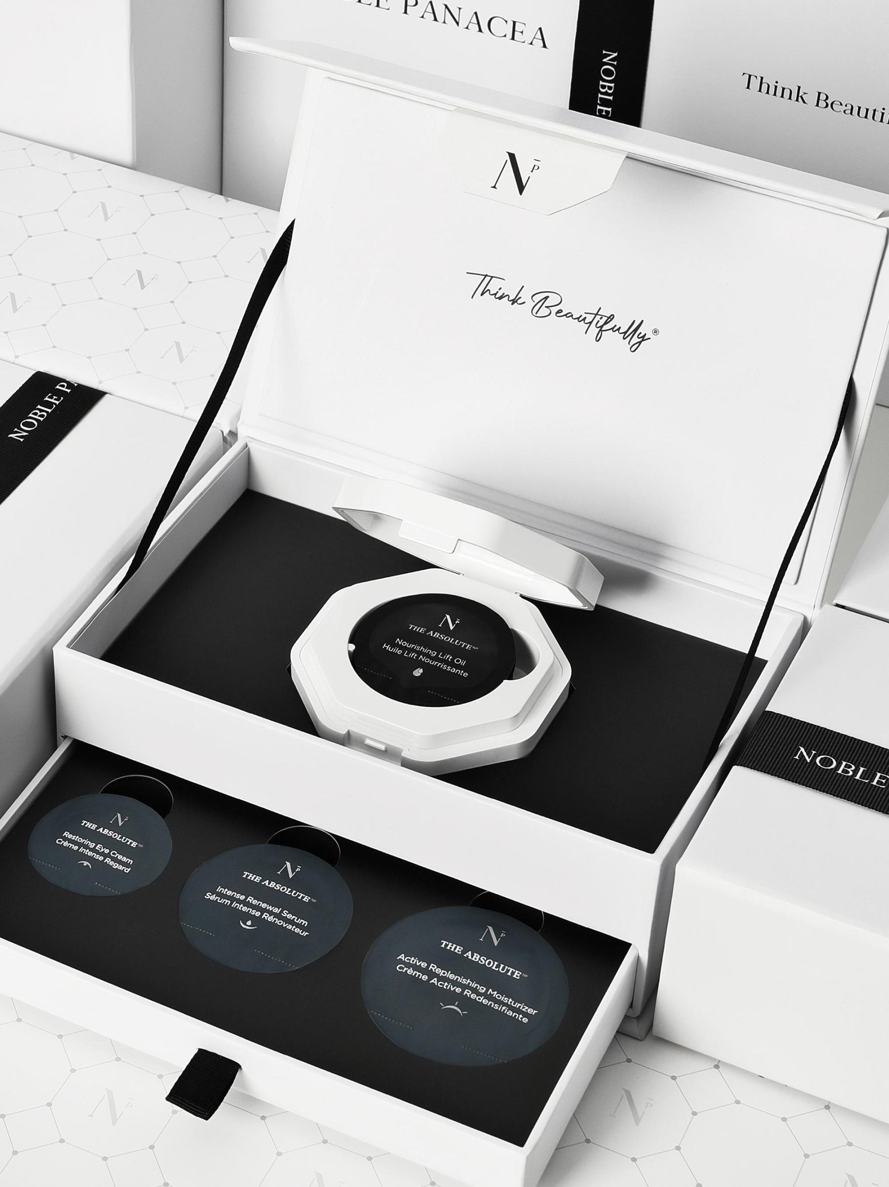 Discover Noble Panacea's Absolute Collection with groundbreaking OSMV™ Technology to help nourish, replenish, and regenerate skin while visibly reducing the appearance of wrinkles for luminous, revitalized, and visibly youthful skin. Experience unparalleled skin results with a complete 1-week transformational daytime beauty ritual featuring The Absolute Collection: Restoring Eye Cream, Intense Renewal Serum, Active Replenishing Moisturizer, and Absolute Nourishing Lift Oil with a mini starch-based box, perfect for on-the-go. Made in USA.