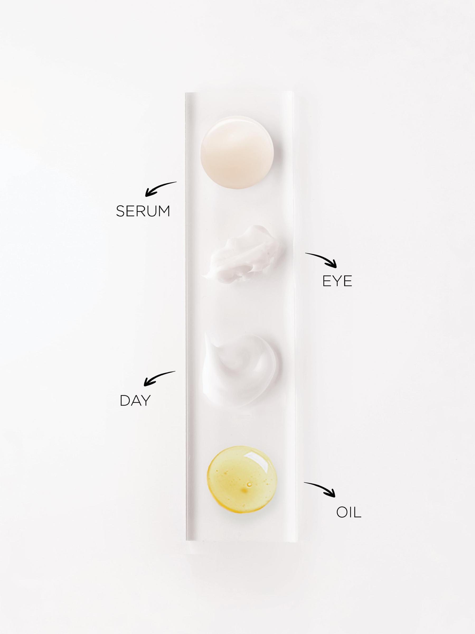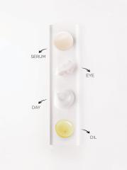 Step 1: SERUM: Apply in the morning to cleansed, dry skin. Gently massage into the face, neck and decolletage in upward and outward motions. Step 2: EYE: gently tap around the entire orbital area, from inner to outer corner, to the temples and below and above the eyes. Step 3: MOISTURIZER: apply in an upwards and outwards motion to the face, neck and decolletage Step 4: OIL: Apply oil to the face, and neck, gently pressing it in, follow with Multi-Defense SPF.