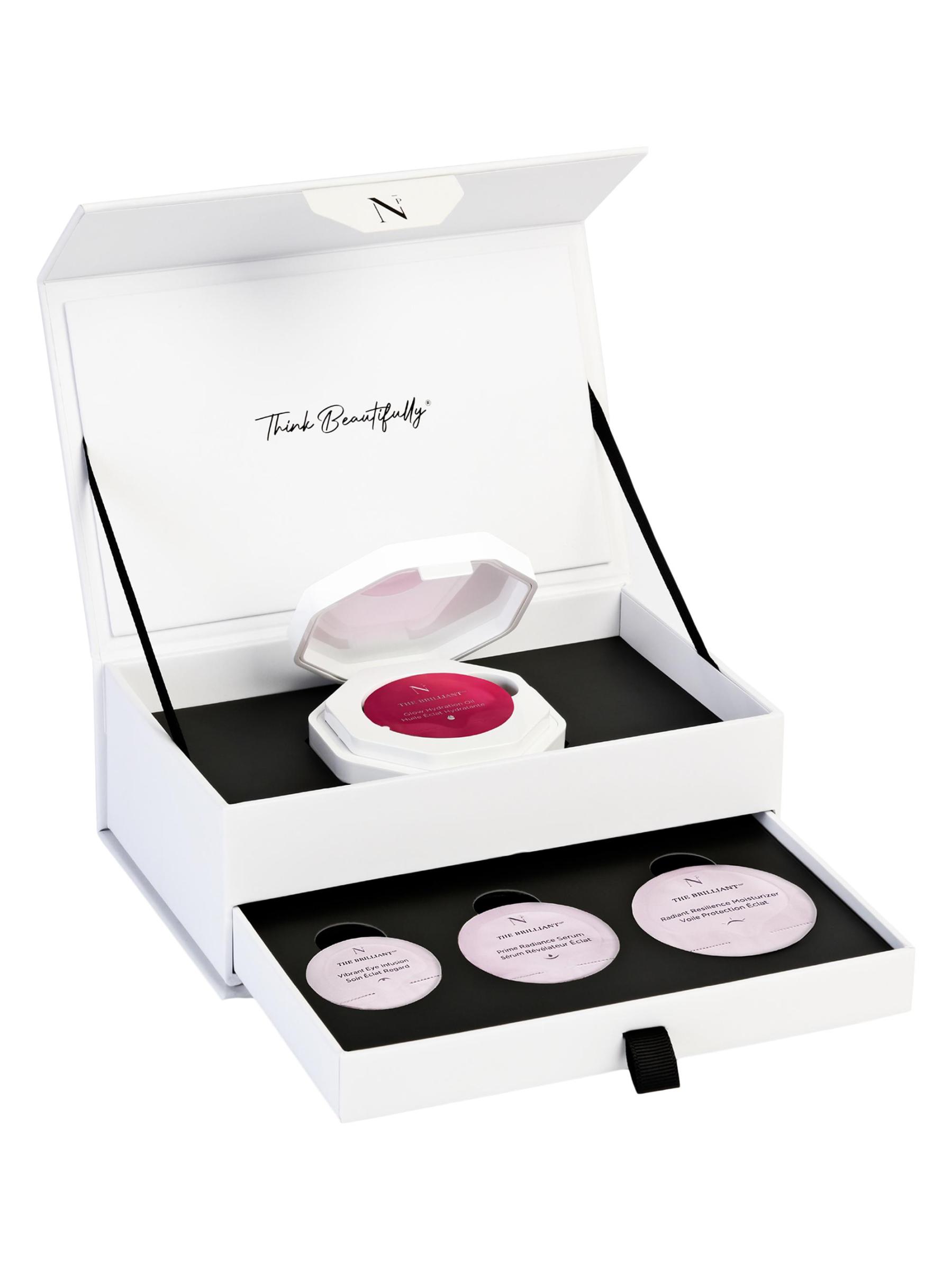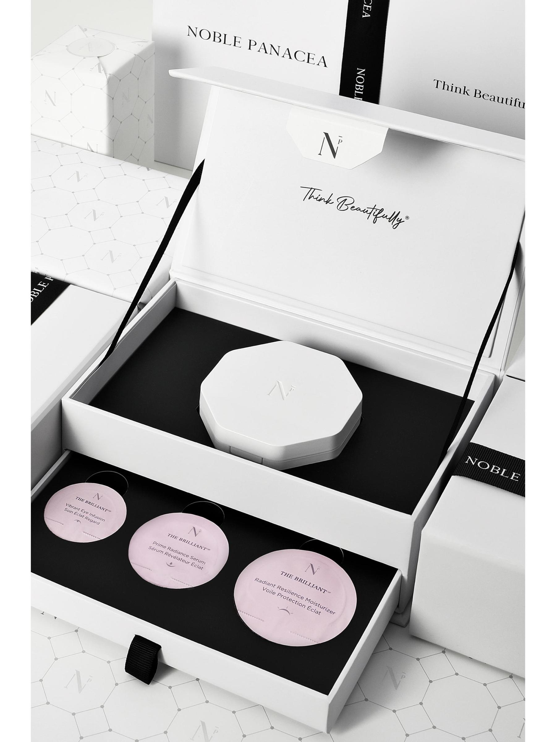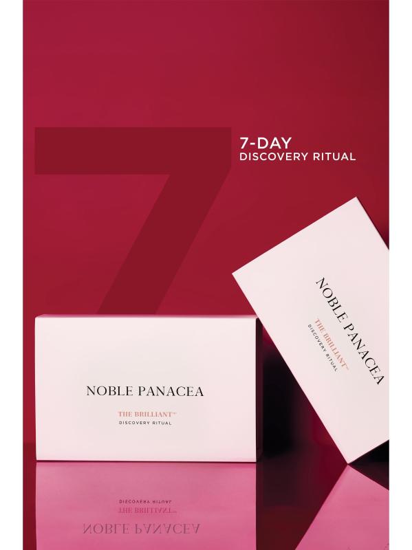 Experience unparalleled skin results with this 1-week transformational daytime ritual featuring 7-doses of Noble Panacea's The Brilliant Collection: Vibrant Eye Infusion, Prime Radiance Serum, Radiant Resilience Moisturizer and Glow Hydration Oil with a mini starch-based box, perfect for on-the-go. Made in USA.