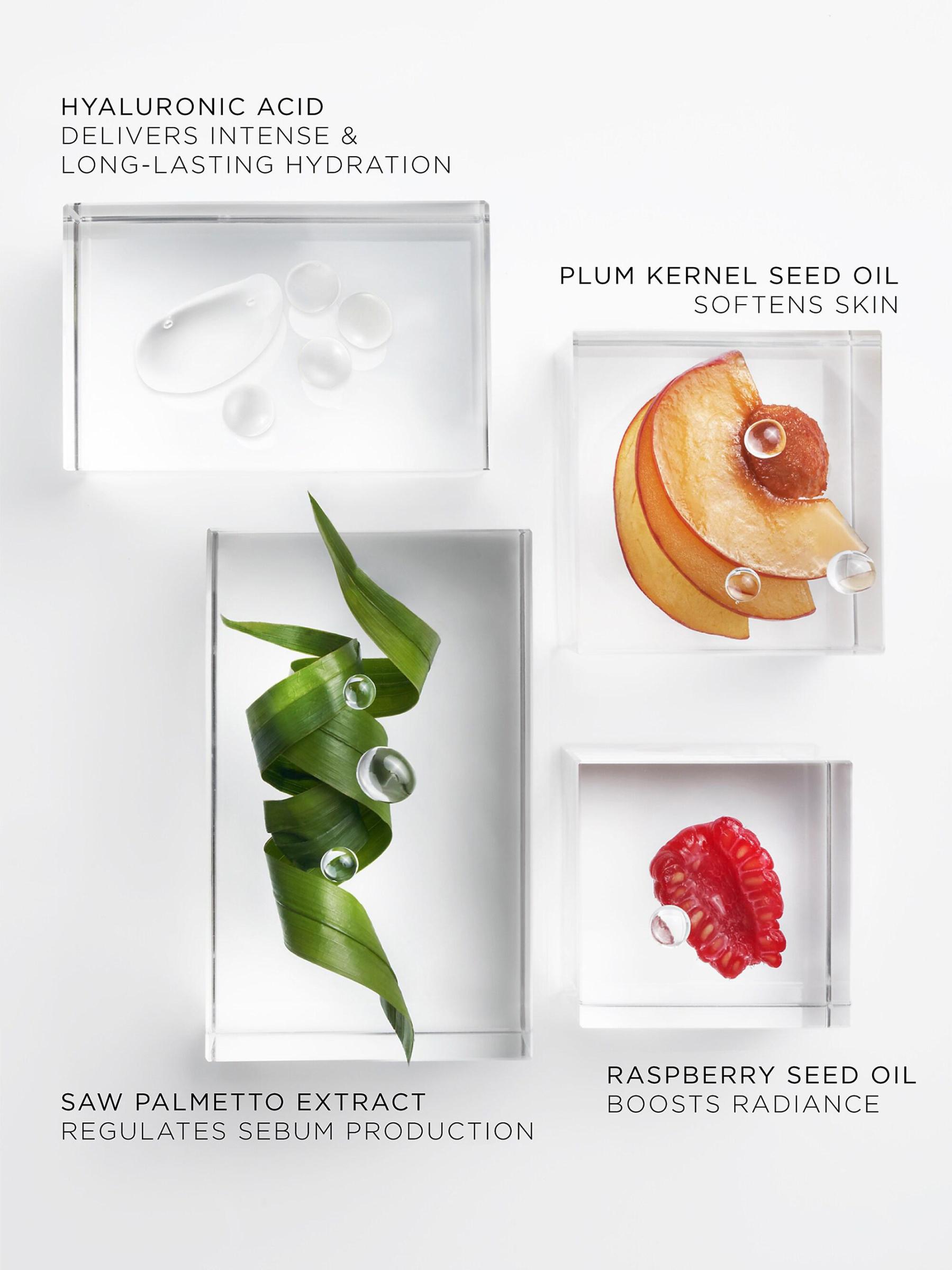 Hyaluronic Acid: a water-soluble active ingredient that is encapsulated in the OSMV™ technology and released to deliver long-term hydration. Raspberry Seed Oil: boosts radiance for a healthy glow. Plum Kernel Seed Oil: softens the skin to leave it supple. Serenoa Serrulata (Saw Palmetto) Extract: helps to regulate sebum production.