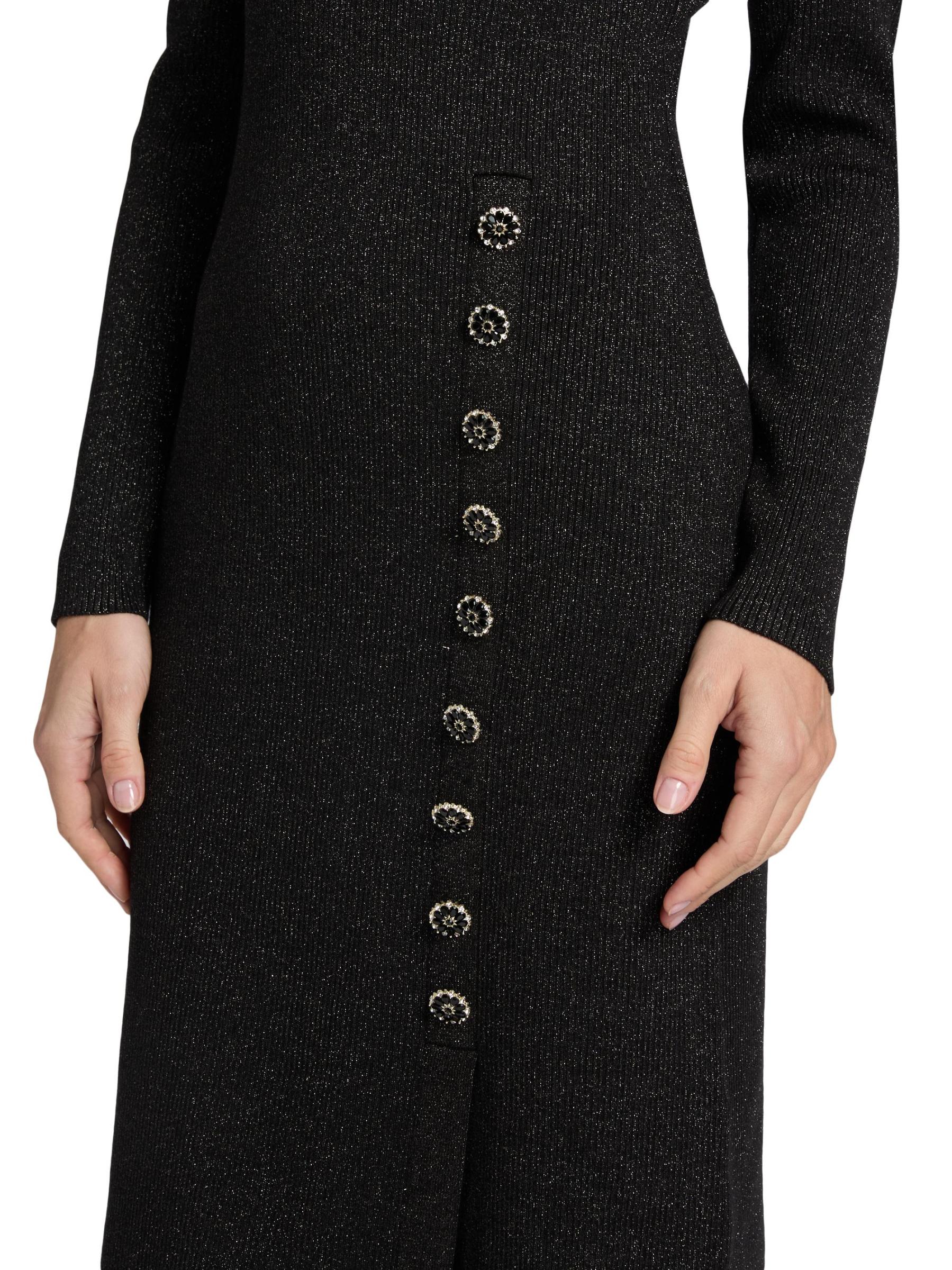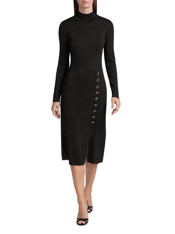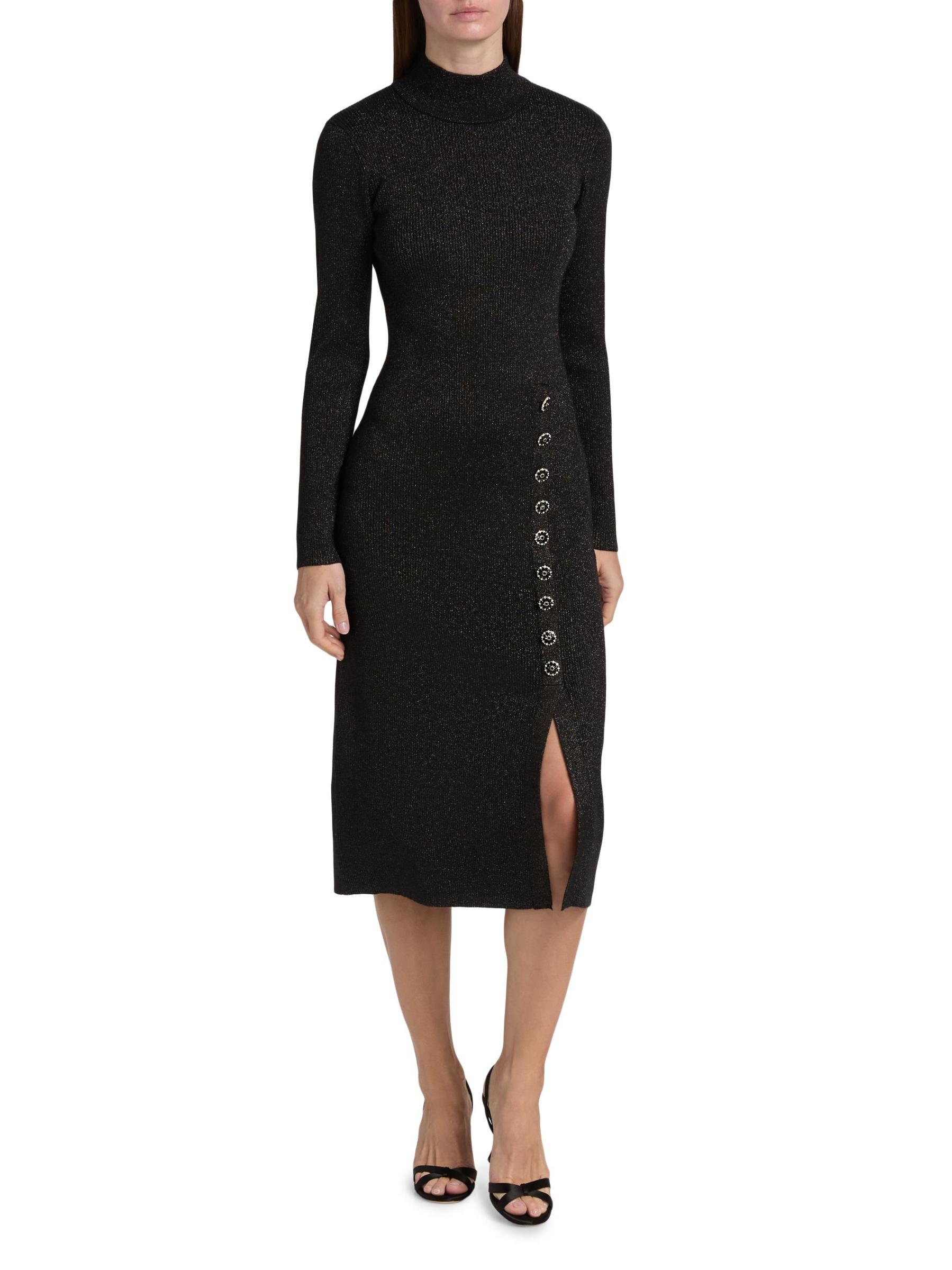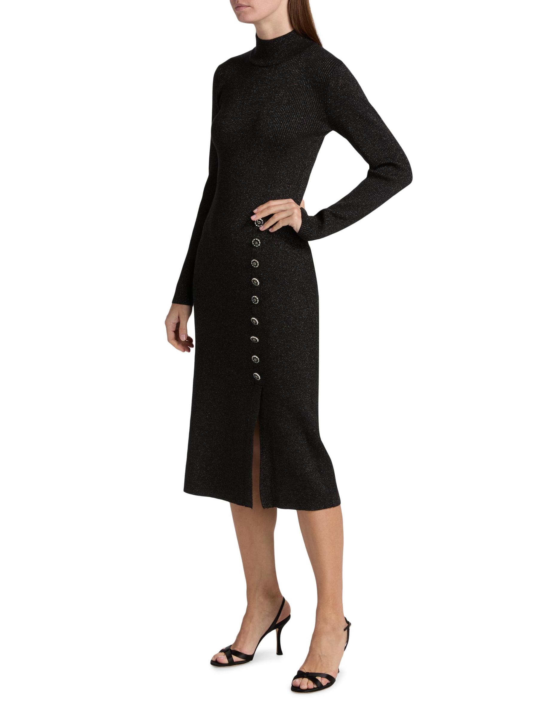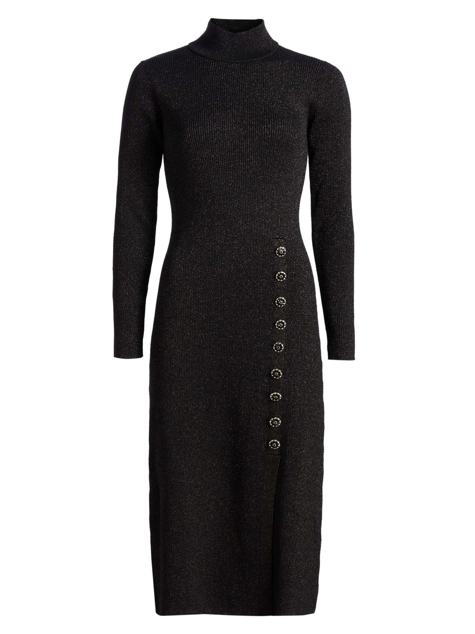 This Chaya midi-sweaterdress from Elie Tahari is crafted of a knit blend and features a mock turtleneck and a side button detail at the front.