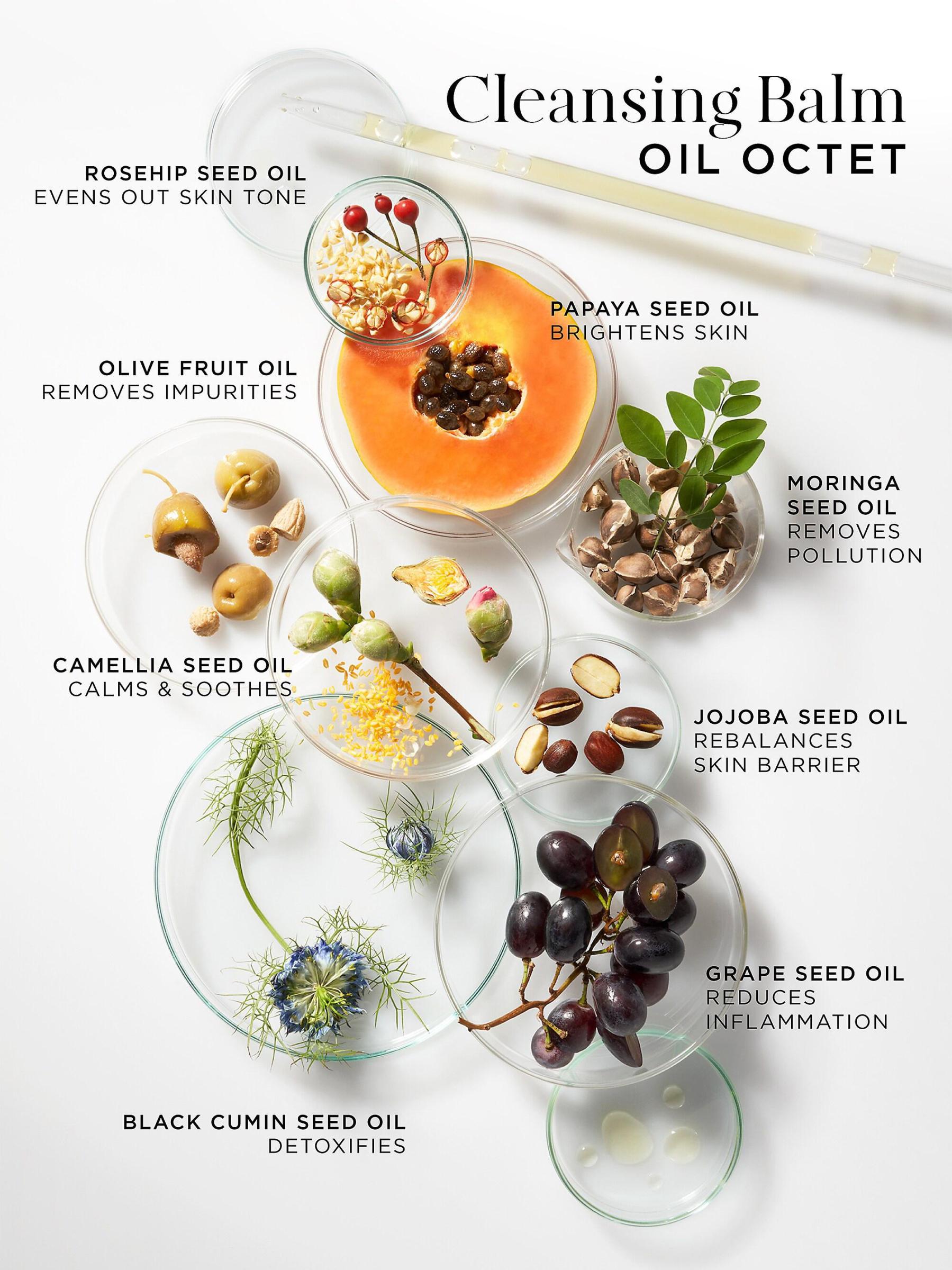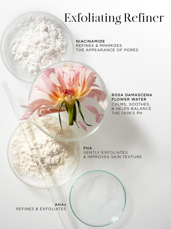 Cleansing Balm: Grape Seed Oil reduces inflammation. Olive Fruit Oil removes impurities. Moringa Seed Oil removes pollution. Black Cumin Seed Oil detoxifies. Jojoba Seed Oil rebalances skin barrier. Camellia Seed Oil calms and soothes. Papaya Seed Oil brightens skin. Rosehip Seed Oil evens out skin tone. Exfoliating Refiner: AHA refines and exfoliates. PHA gently exfoliates and improves skin texture. Niacinamide refines and minimizes the appearance of pores. Rosa Damascena Flower Water calms, soothes, and helps balance the skin’s pH.