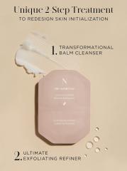 Step 1: Apply the Cleansing Balm onto dry skin and gently massage the face, neck, and eye area until the balm transforms into an oil. Rinse with lukewarm water for the oil to transform into a milky emulsion as the final step. Then, rinse off completely and pat dry. Step 2: Press the Exfoliating Refiner into the skin with fingertips or swipe across the skin with a pad. Avoid eye area.