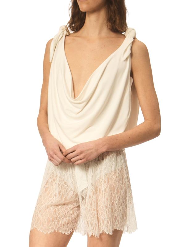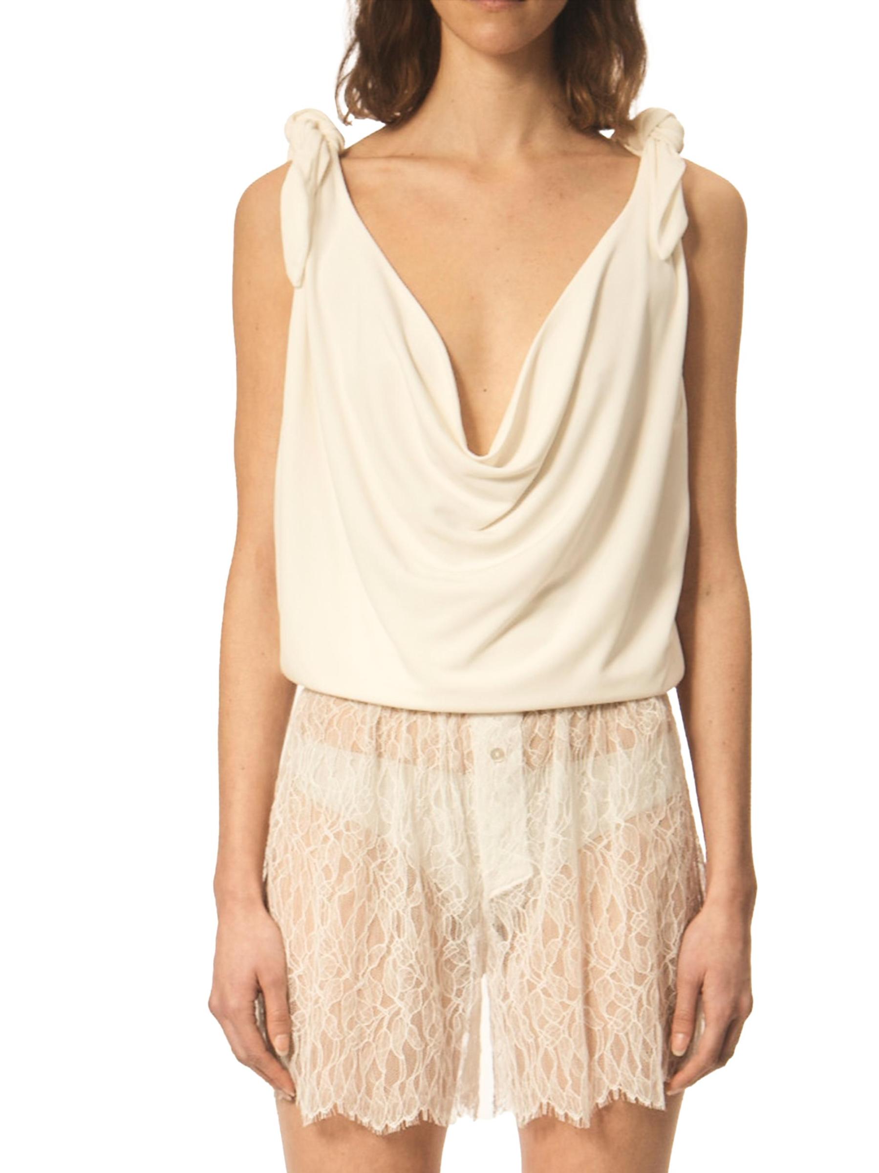 The Fern top from Interior flaunts a plunging cowl neck and knotted shoulder straps.