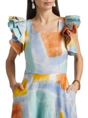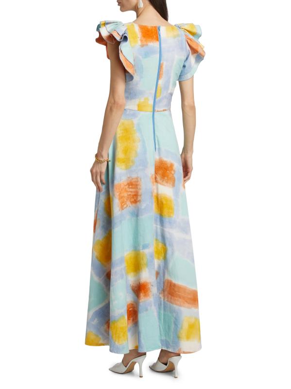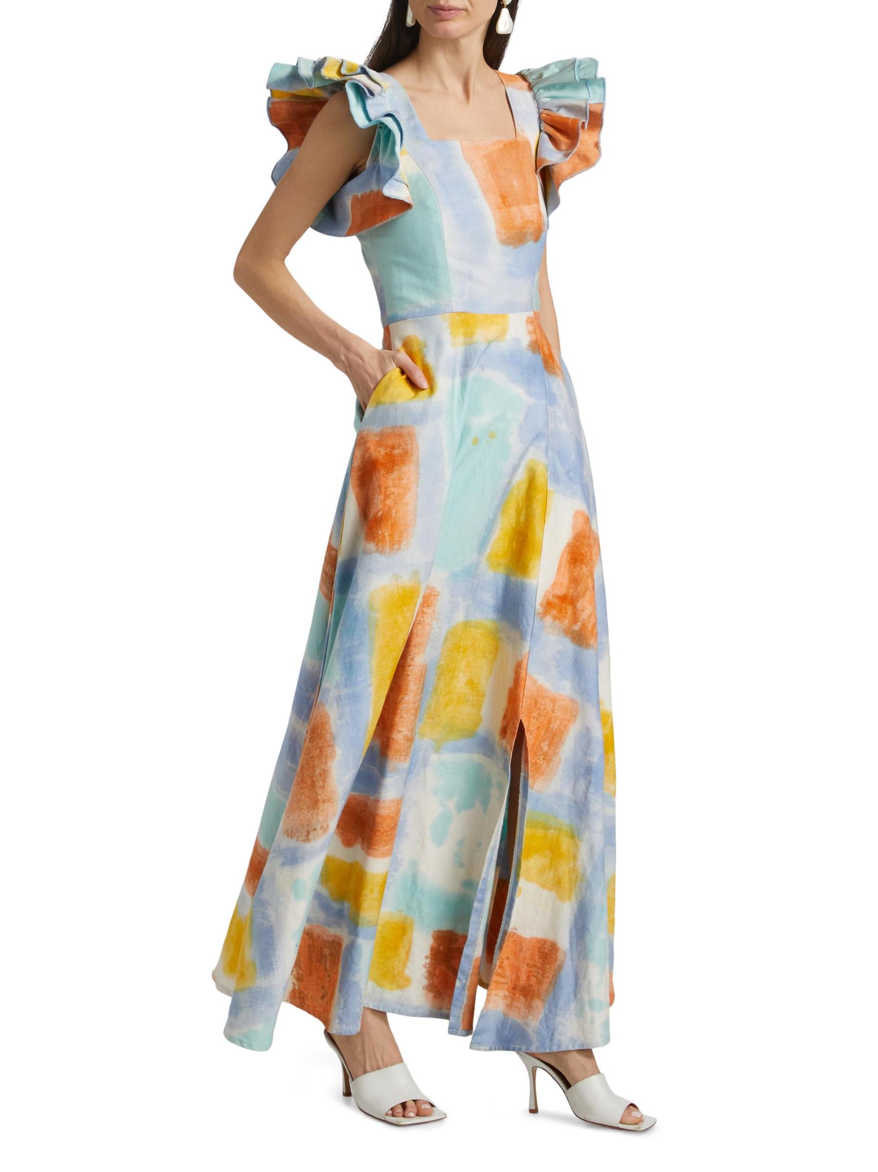 EXCLUSIVE. Busayo's Tokunbo maxi dress captivates with its watercolor hand-drawn print, merging artistic expression with timeless charm. Carefully hand-dyed by talented Nigerian artisans, each piece is a true original, showcasing intentional variations that celebrate individuality and skillful craftsmanship.Squareneck Flutter sleeves Side on-seam pockets Back zip clsorue 100% Cotton Lining: 100% Cotton Dry clean Imported