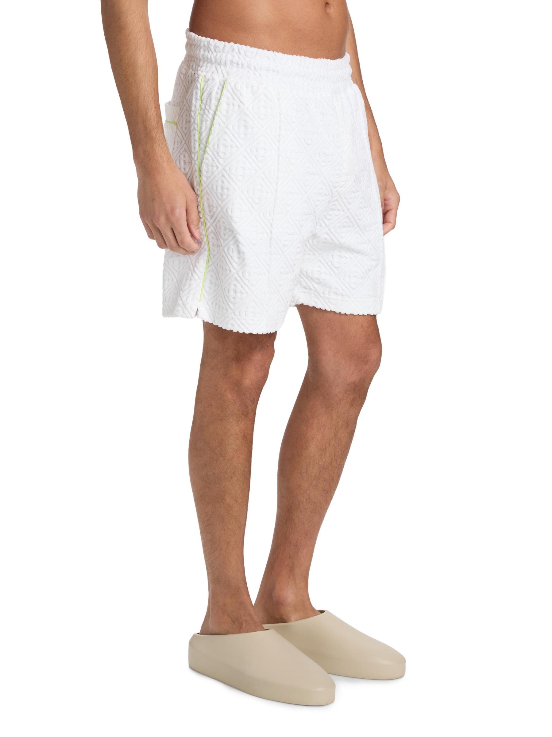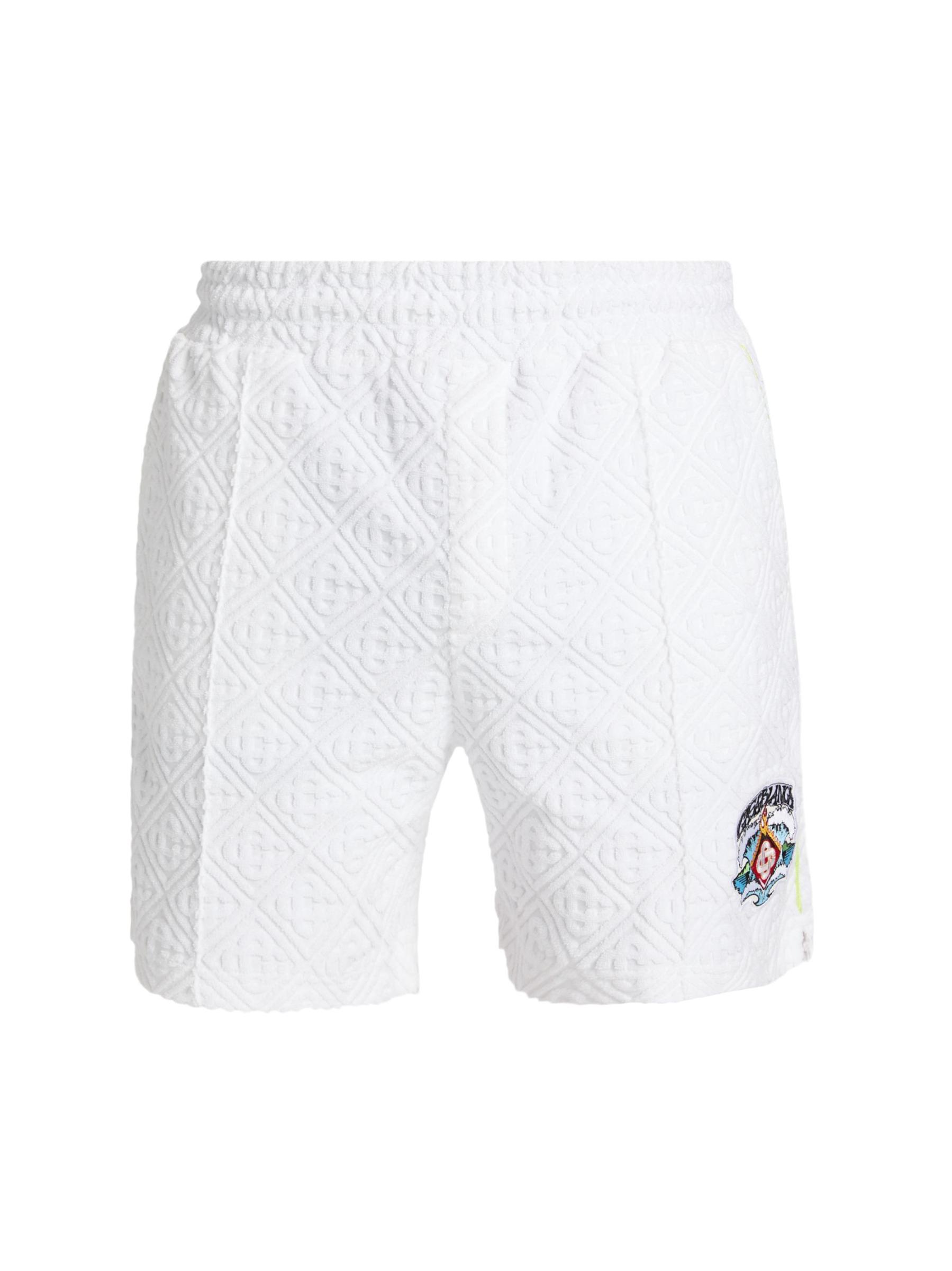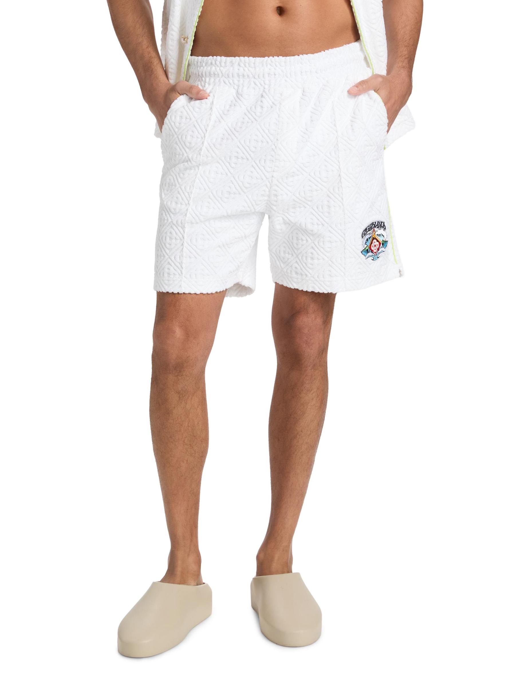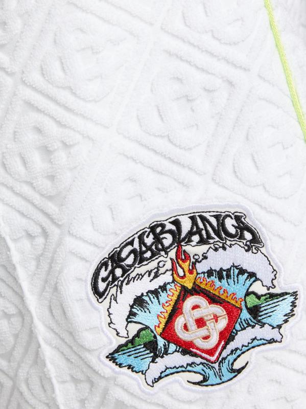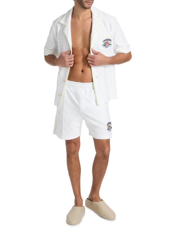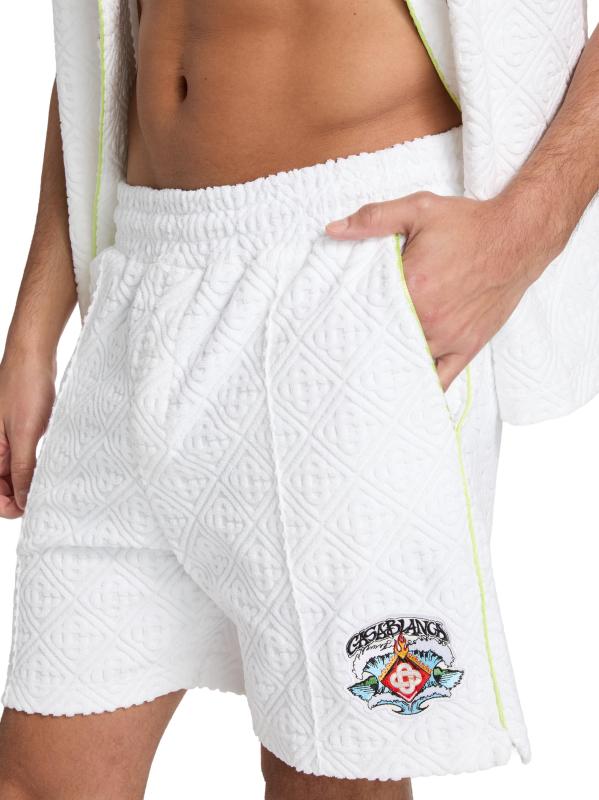 Crafted of cotton-blend terrycloth in a textured monogram jacquard, these shorts from Casablanca are finished with an embroidered logo motif at the hem. Front pintucks and contrasting piped trim finish the look.Elasticized waistband Side seam pockets Back patch pocket Pulls on 86% cotton/13% polyamide/1% elastane Lining: 100% Cotton Embroidery: 100% Polyester Machine wash Made in Portugal