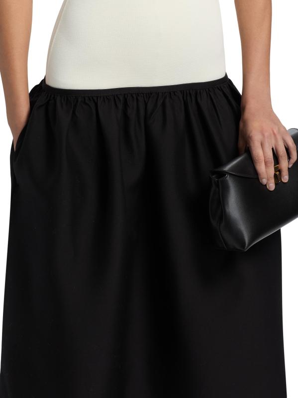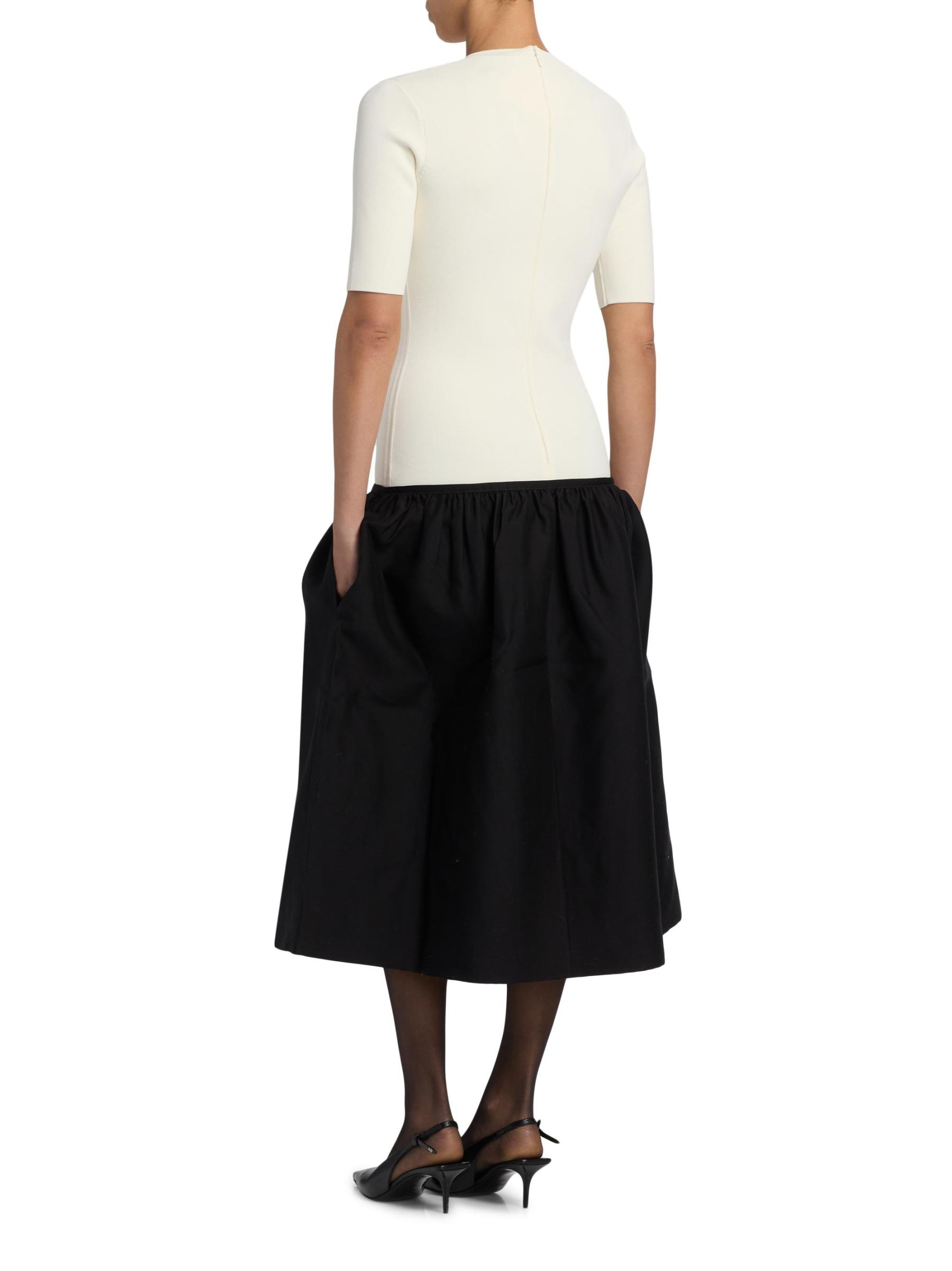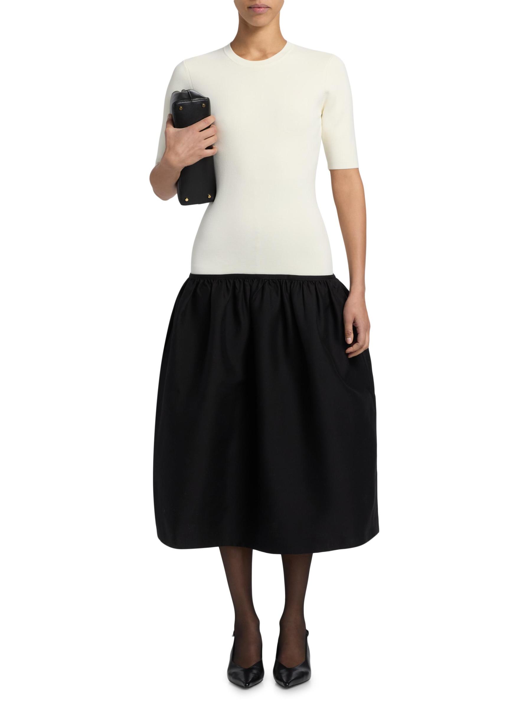 This mixed-media colorblocked Twinflower midi-dress from Toteme features a fitted T-shirt bodice, dropped waist, and contrasting full skirt.