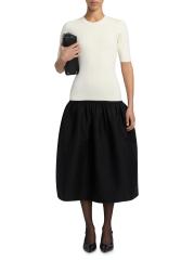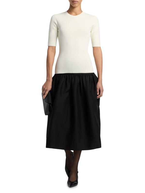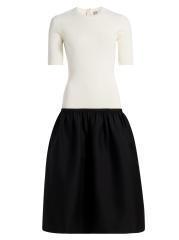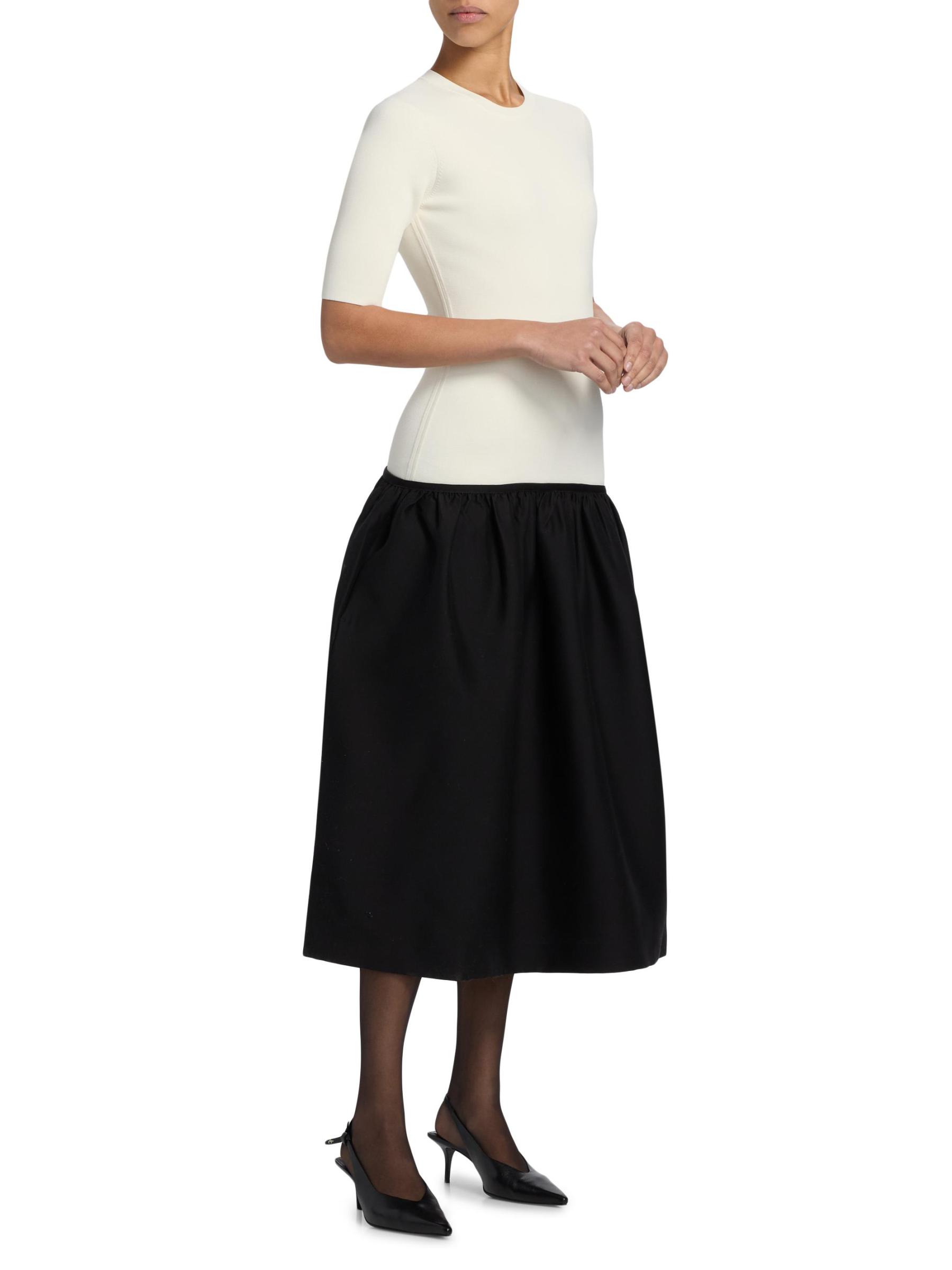 This mixed-media colorblocked Twinflower midi-dress from Toteme features a fitted T-shirt bodice, dropped waist, and contrasting full skirt.Crewneck Short sleeves Drop waist Side slip pockets Back zip closure Combo: 81% wool/19% silk Dry clean Imported