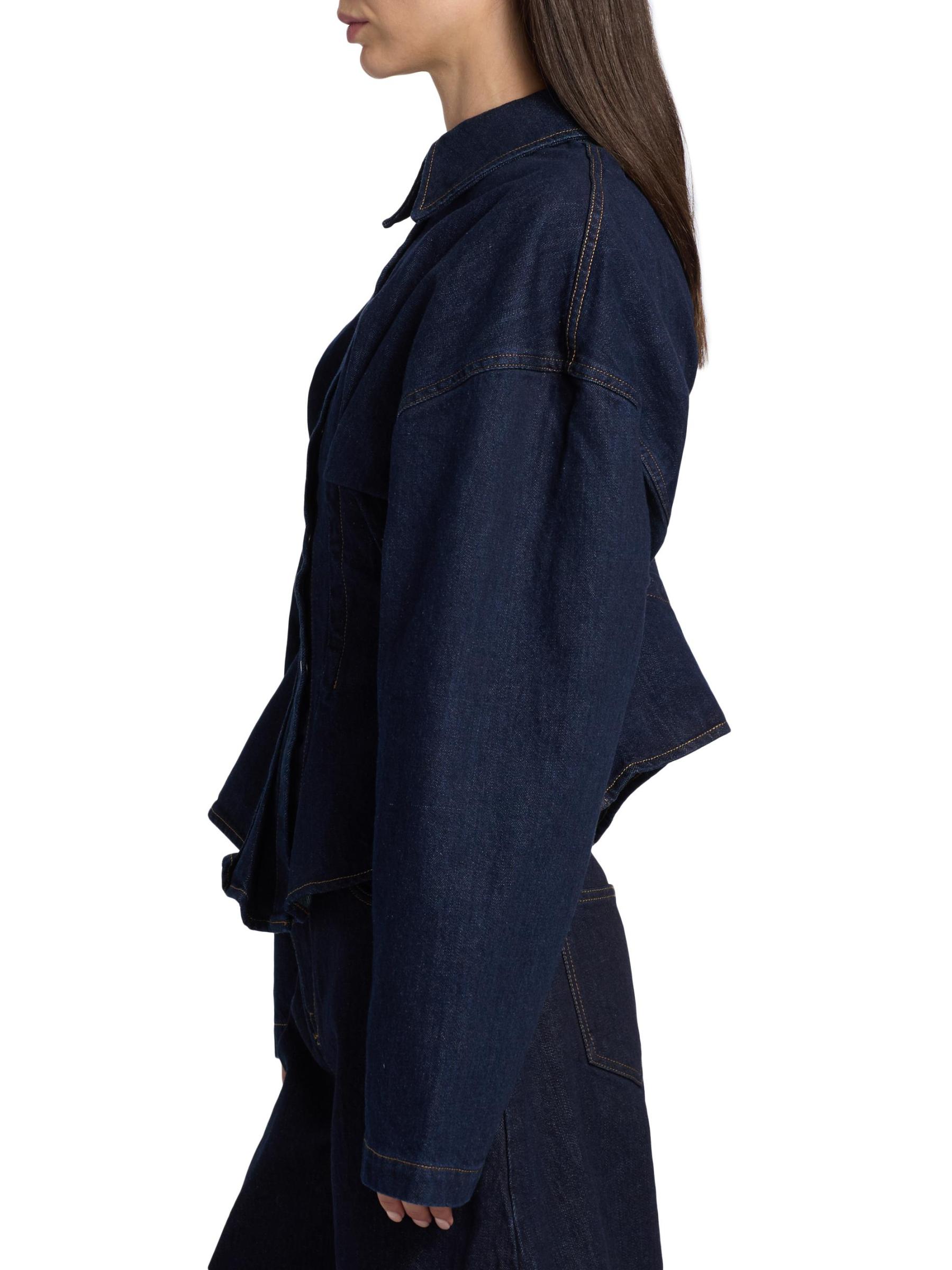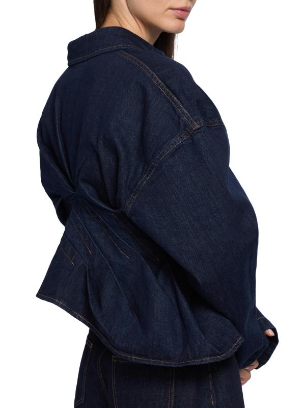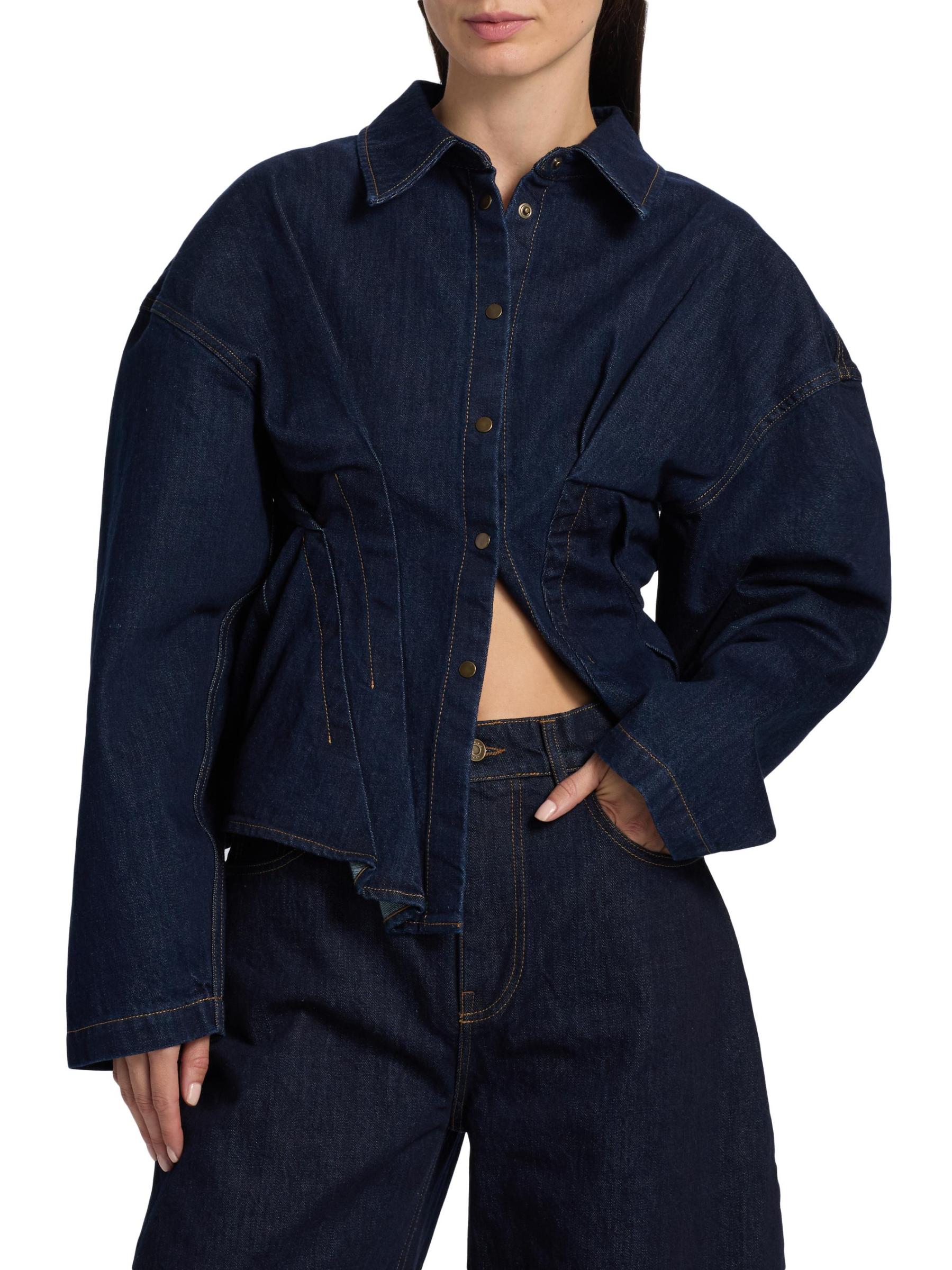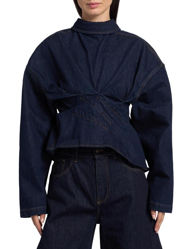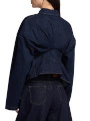 A.W.A.K.E. Mode's denim shirt is styled with seam detailing for a cinched waist and a twisted back. Curved blouson long sleeves complete the look.