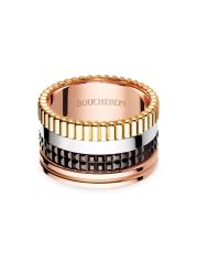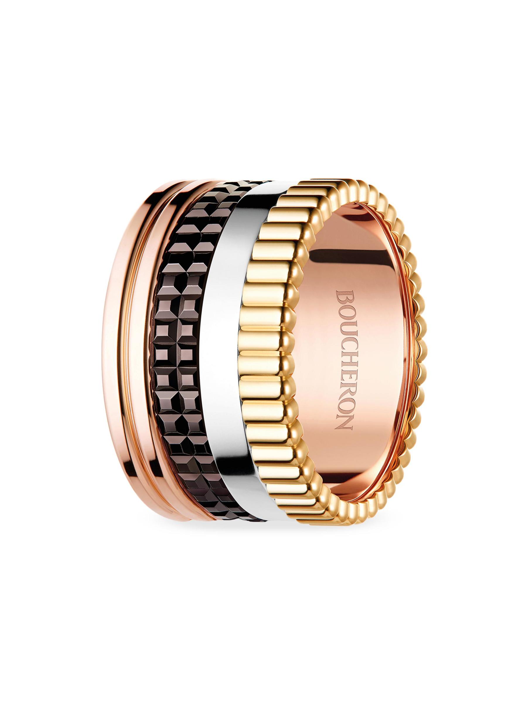 From the Quatre Collection. Boucheron's ring features four fused 18K gold bands with varying tones and textures for a bold, dimensional effect.18K yellow, white and rose gold Brown PVD Made in Switzerland