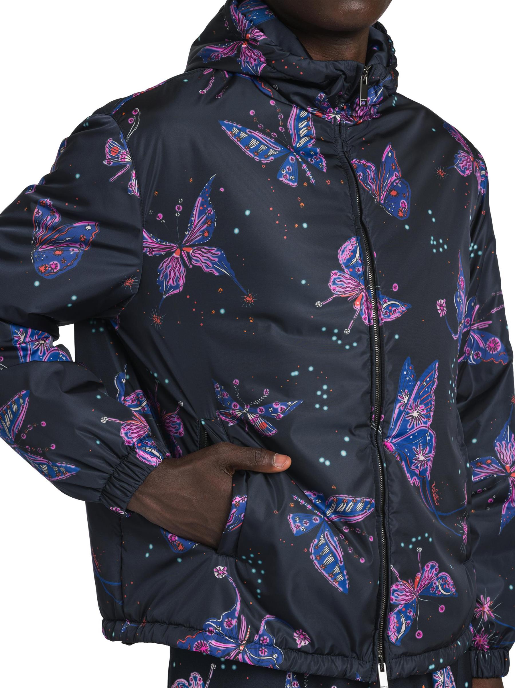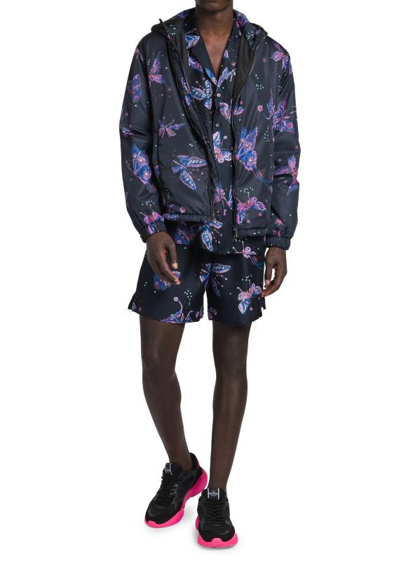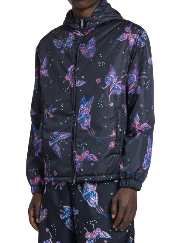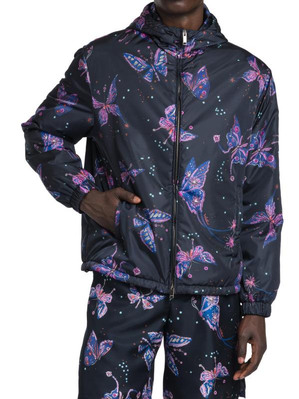 Valentino's creative director Pierpaolo Piccioli plays with an electric palette, billowing silhouettes, and silk fabrics in his most recent collection. With an obvious ode to the label's history, Piccioli blends embroidery, micro-shorts, and gender-fluidity into garments that successfully speak to both tradition and Gen Z. This jacket features a bufferfly print and a hood.Hood Zip front closure Side slip pockets Long sleeves Elastic cuffs 100% Polyamide Lining: 100% polyester Dry clean Made in Italy