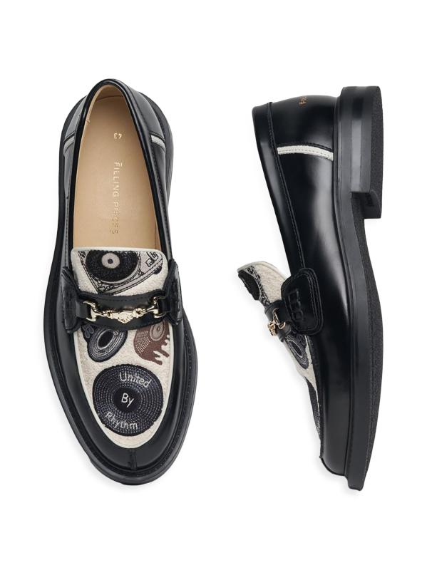 These Filling Pieces loafers are crafted of leather and feature an embroidered vinyl motif on the bouclé almond toes. Goldtone signature handshake horsebits lend an elevated finish to this pair.Almond toe Slips on Leather/ polyester upper Rubber sole Made in Portugal