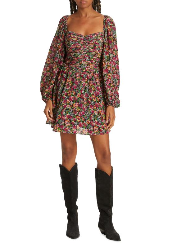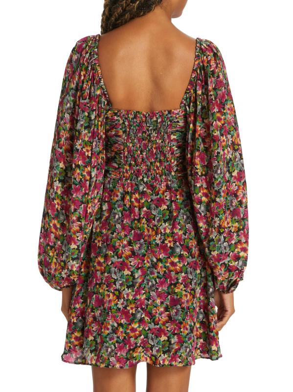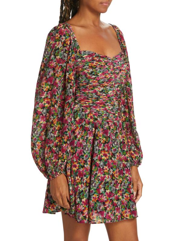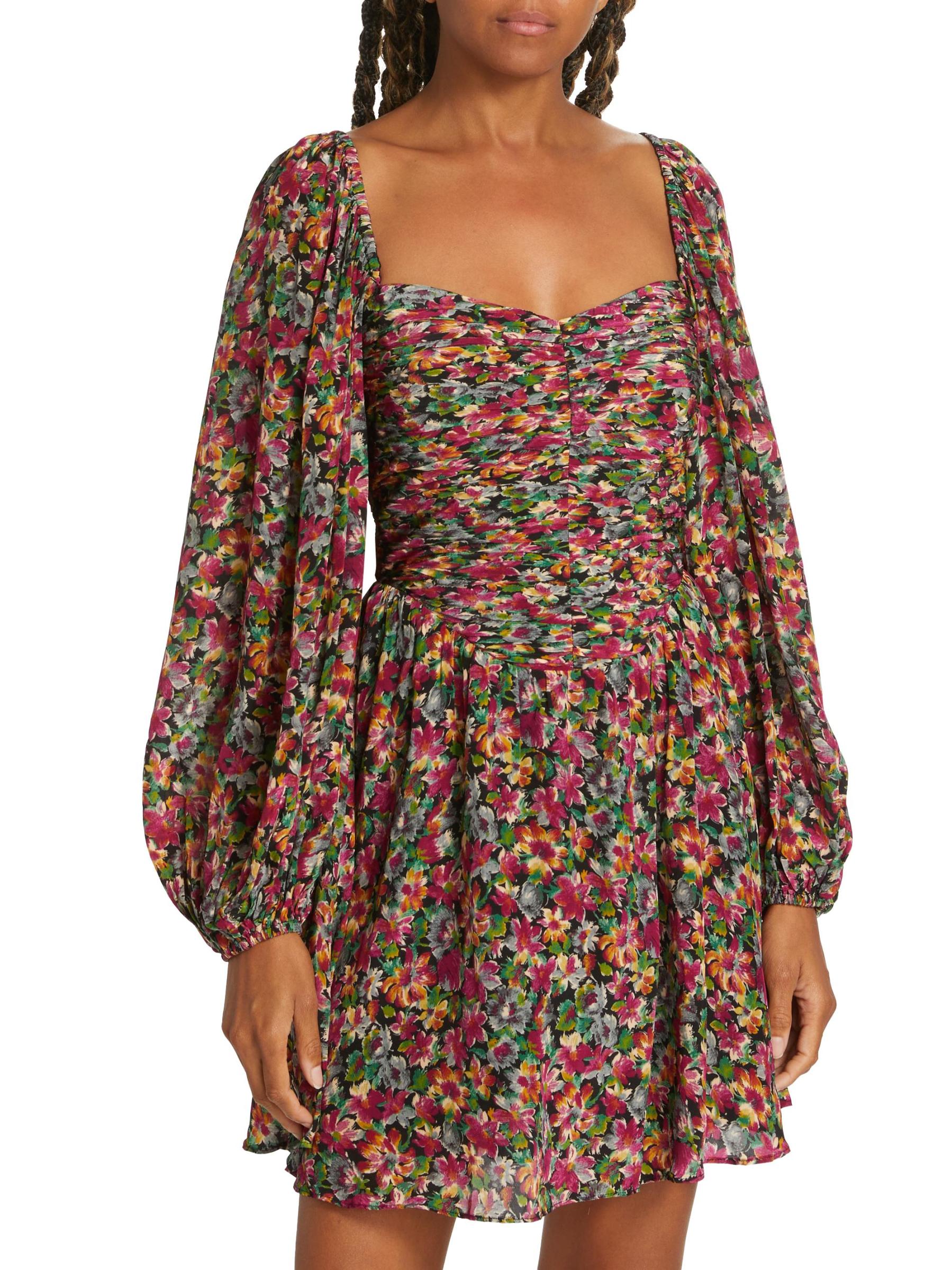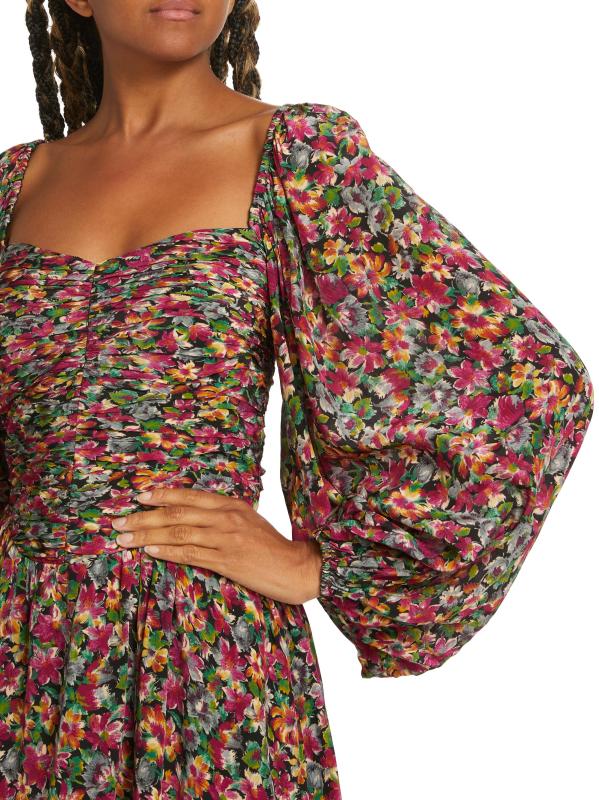 Animated in a blooming floral print, the westside's Vivan dress flaunts a sweetheart neck complemented by a ruched bodice. This piece is framed with voluminous puffed sleeves and a flared skirt.Sweetheart neck Long sleeves Elastic cuffs Smocked back Back zip closure 100% Viscose Lining: 100% polyester Dry clean Imported