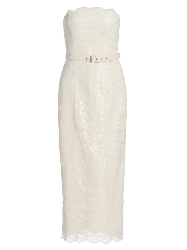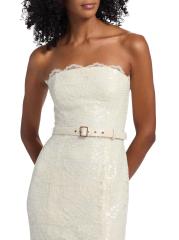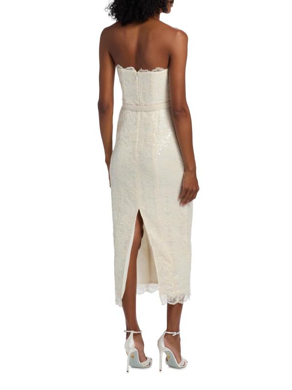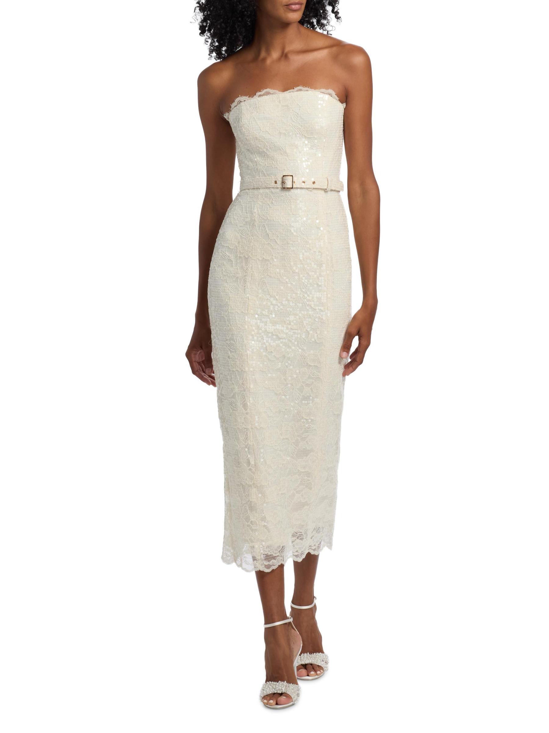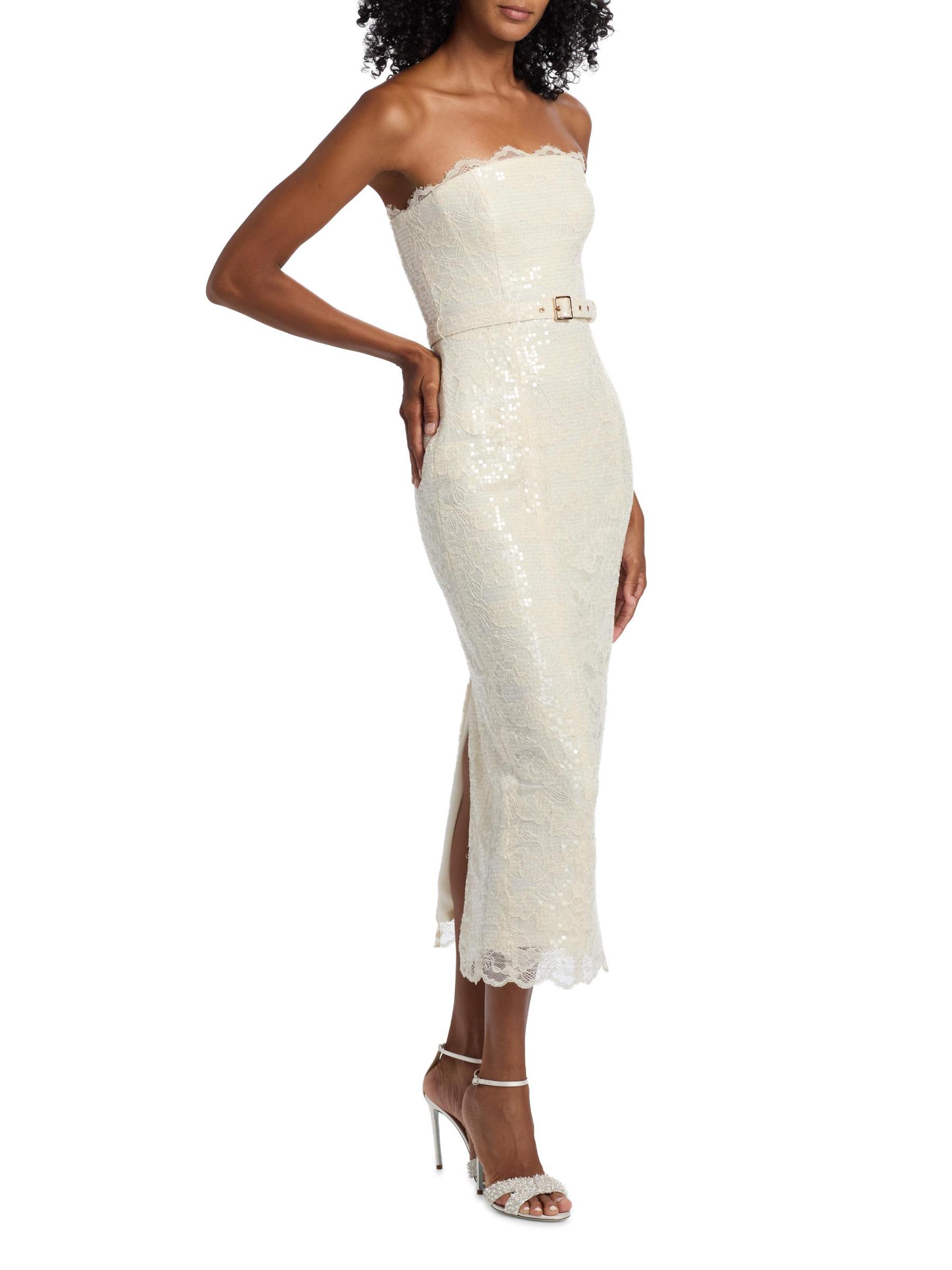 This Vivian lace midi-dress from Toccin features lustrous tonal sequins, scalloped lace trim, and a back slit. The piece is cut in a sheath silhouette and detailed with a self buckle belt.Straight neckline Strapless Self buckle belt Concealed back zip closure 67% nylon/33% cotton Hand wash Imported