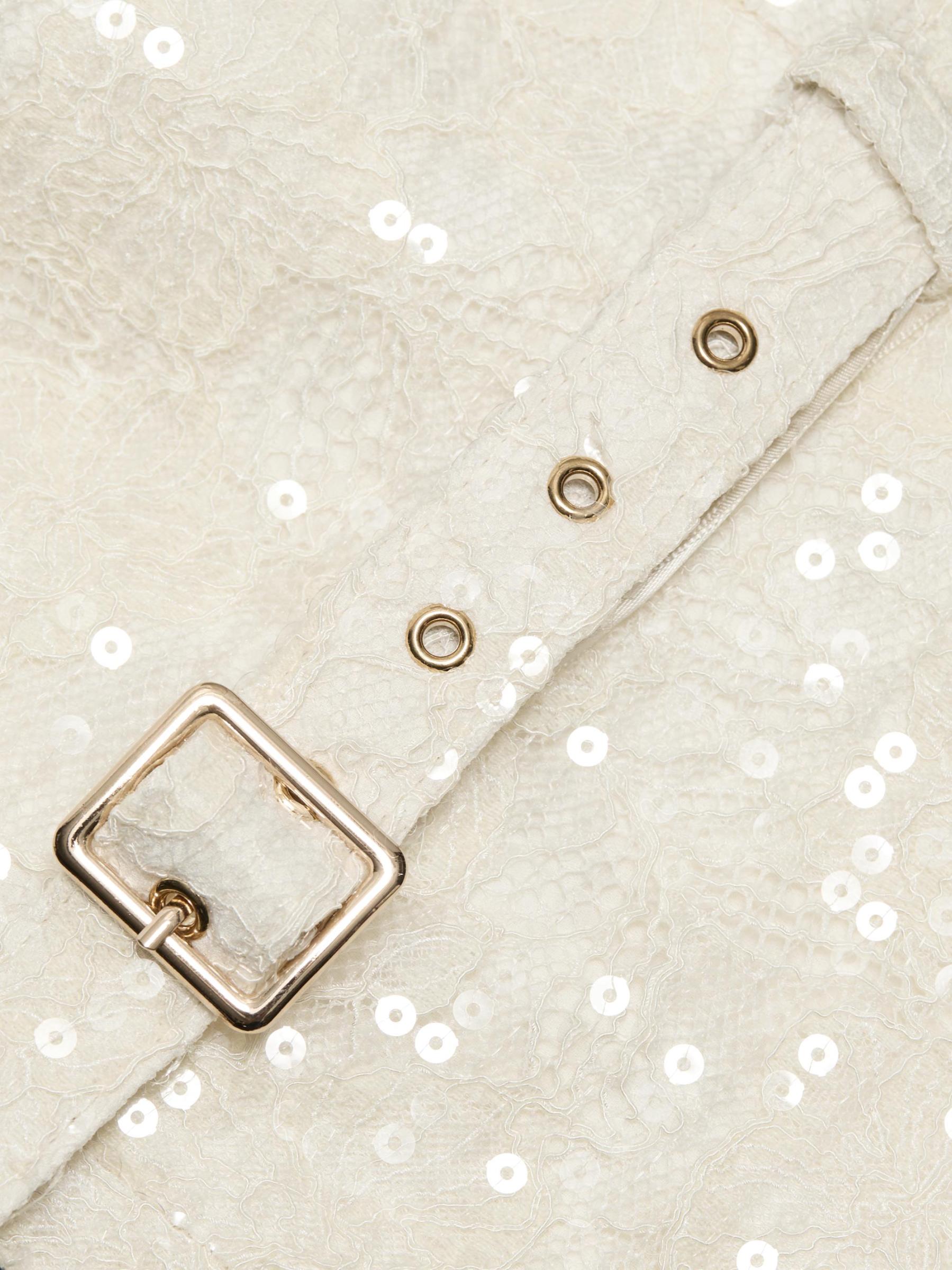 This Vivian lace midi-dress from Toccin features lustrous tonal sequins, scalloped lace trim, and a back slit. The piece is cut in a sheath silhouette and detailed with a self buckle belt.