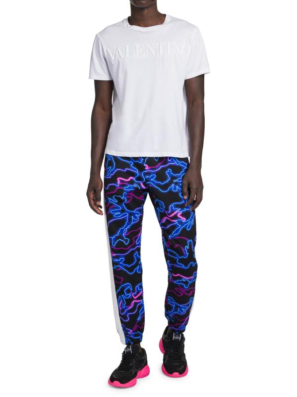 Valentino's creative director Pierpaolo Piccioli plays with an electric palette, billowing silhouettes, and silk fabrics in his most recent collection. With an obvious ode to the label's history, Piccioli blends embroidery, micro-shorts, and gender-fluidity into garments that successfully speak to both tradition and Gen Z. These sweatpants feature a camo print and a drawstring elastic waistband.