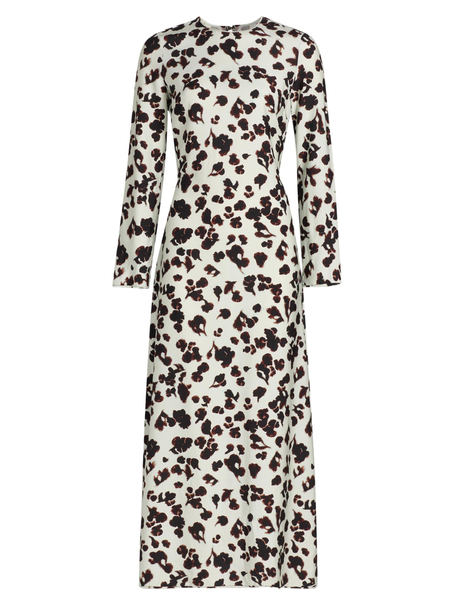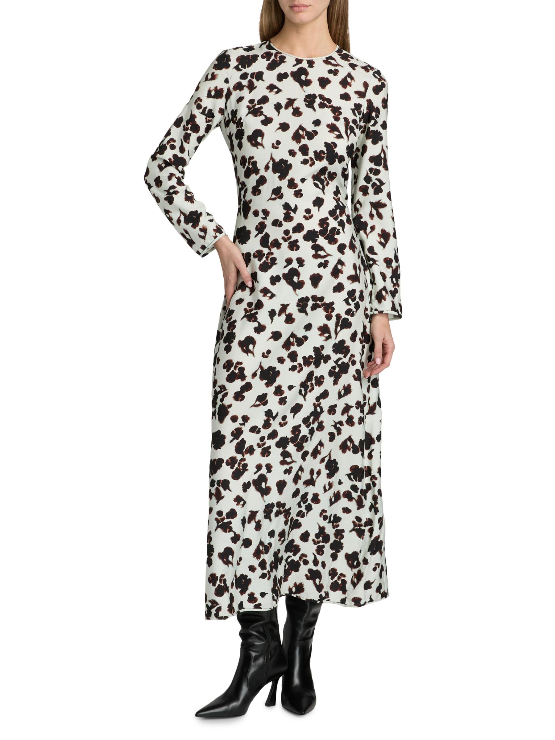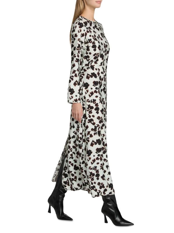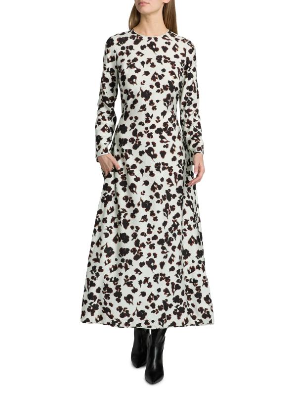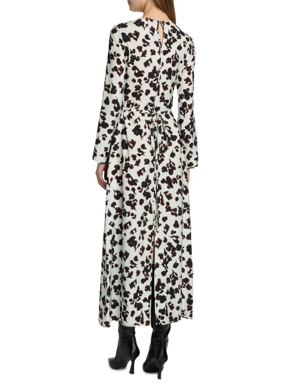 This maxi dress from Proenza Schouler White Label features a floral print, jewel neck, and self-tie belt.Jewel neck Long sleeves Self-tie waist Back slit Back button keyhole closure 89% rayon/11% nylon Dry clean Imported