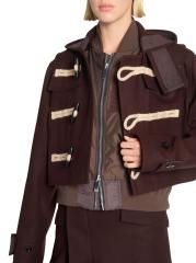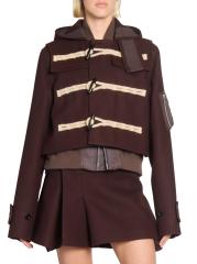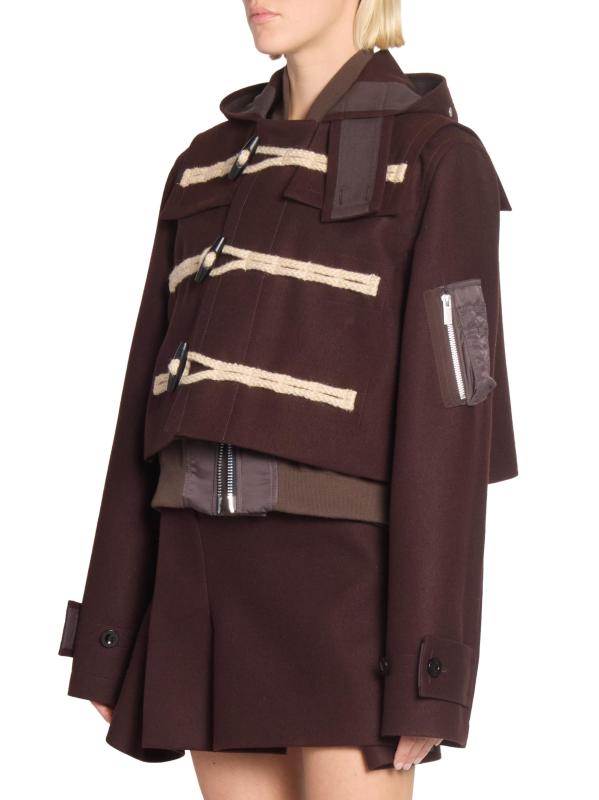 Sacai's cropped duffle-inspired jacket features a front toggle closure with contrast rope loops.Removable hood Long sleeves, cuff tabs Chest flap pockets Sleeve zip pocket Front toggle closure 100% wool Combo 1: 100% nylon Combo 2: 55% polyester/44% cotton/1% polyurethane Dry clean Made in Japan