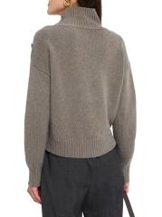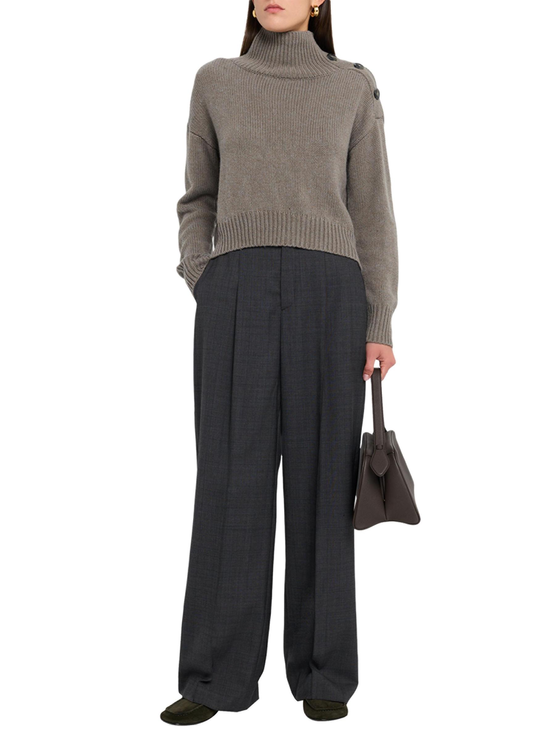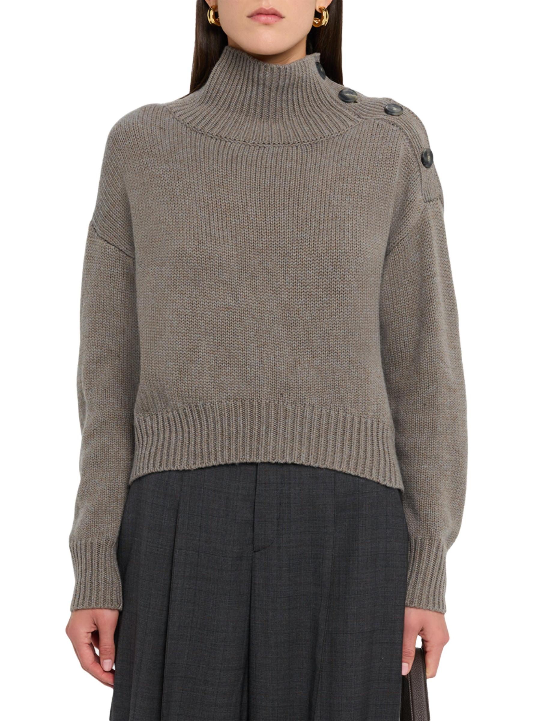 Knit from wool and cashmere, this cozy sweater from Yves Salomon is styled with turtleneck, a buttoned shoulder, and rib-knit trim.